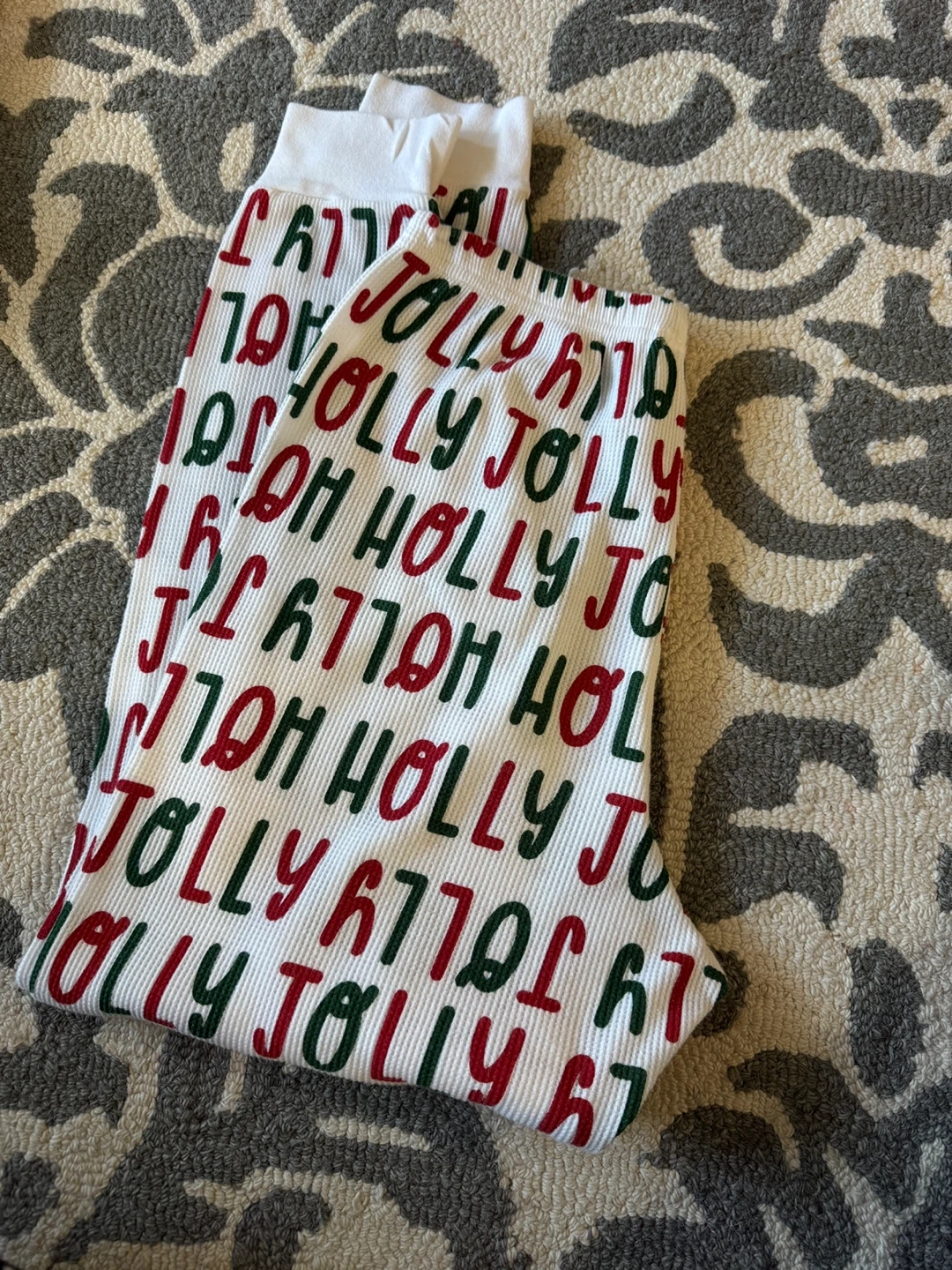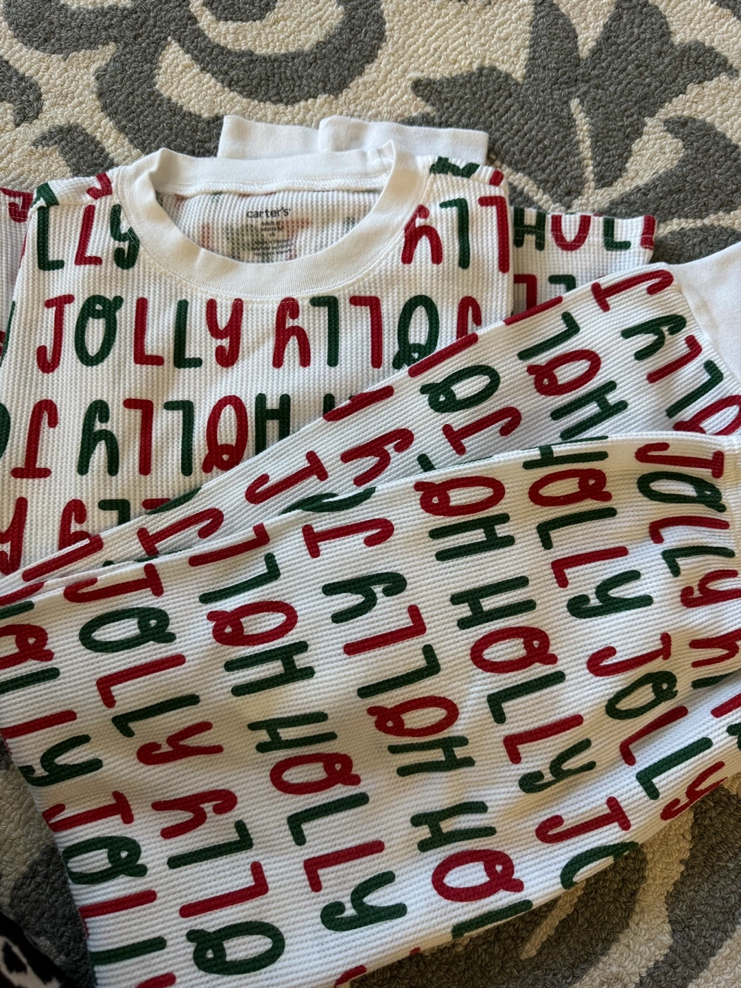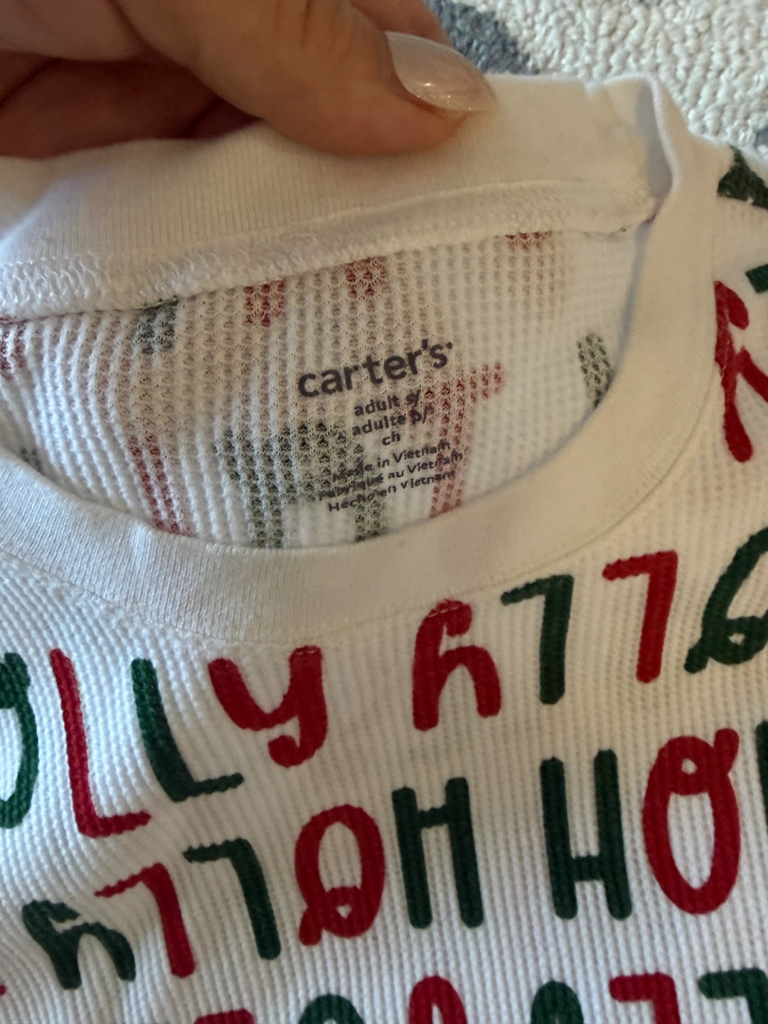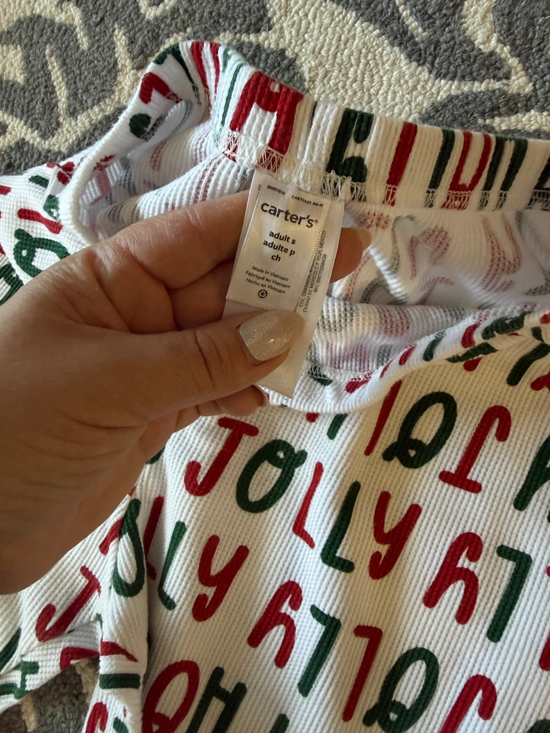 Get ready for the holidays with this adorable Carter's matching pajama set! The set includes a long-sleeved top and pants, both in size adult small/child. The material is comfortable and perfect for lounging around the house during the festive season. The white base is covered in a fun "HOLLY JOLLY" print in red and green