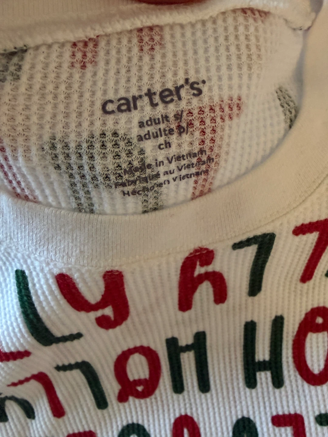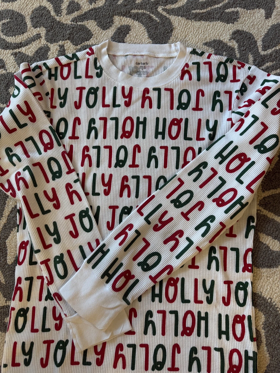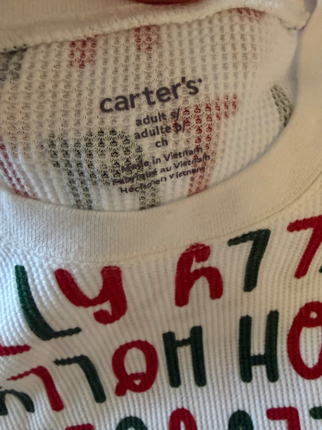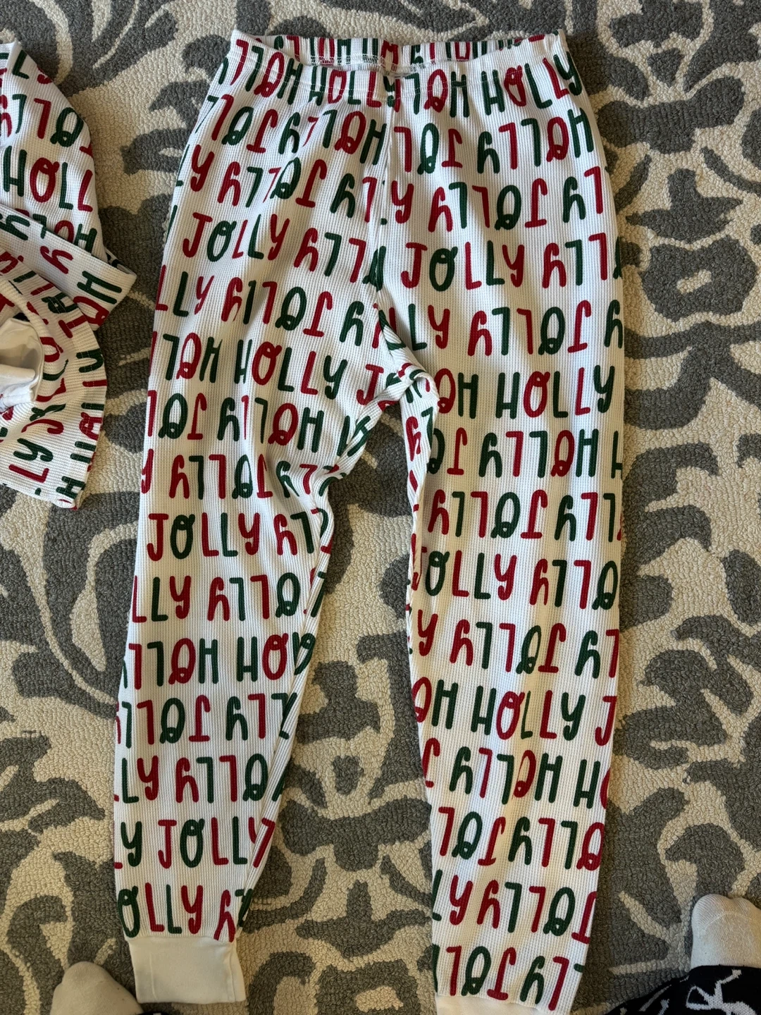 Get ready for the holidays with this adorable Carter's matching pajama set! The set includes a long-sleeved top and pants, both in size adult small/child. The material is comfortable and perfect for lounging around the house during the festive season. The white base is covered in a fun "HOLLY JOLLY" print in red and green