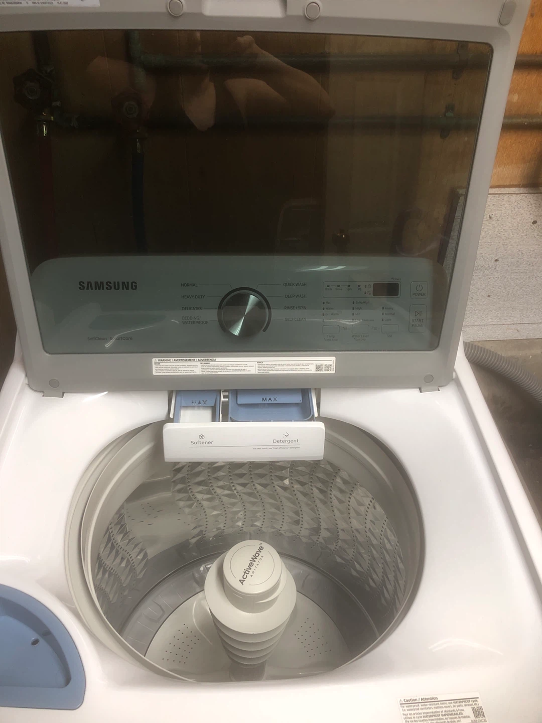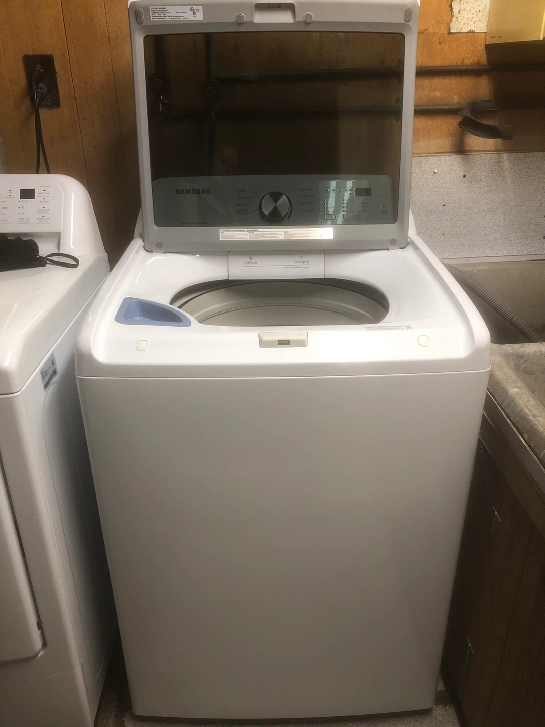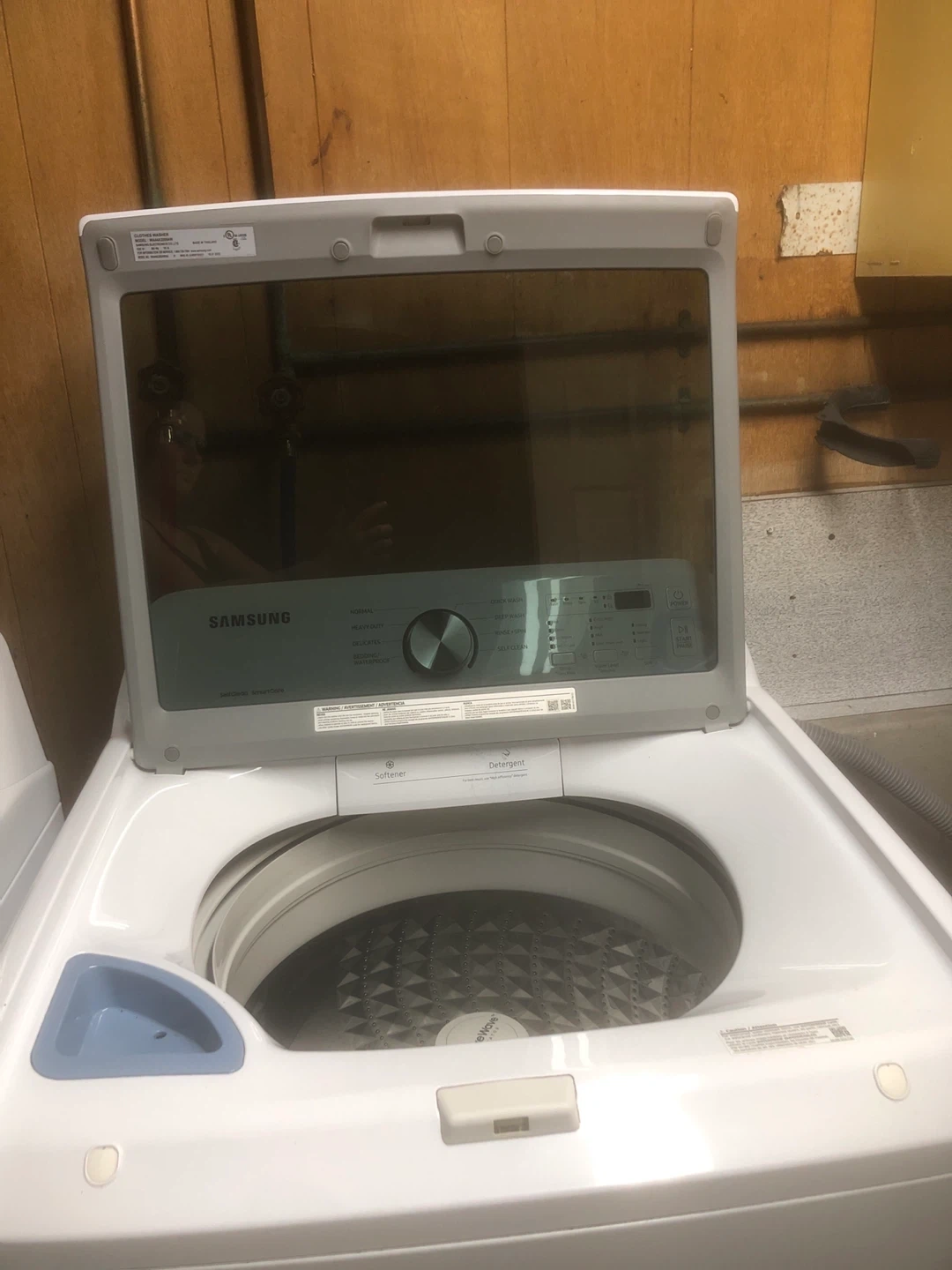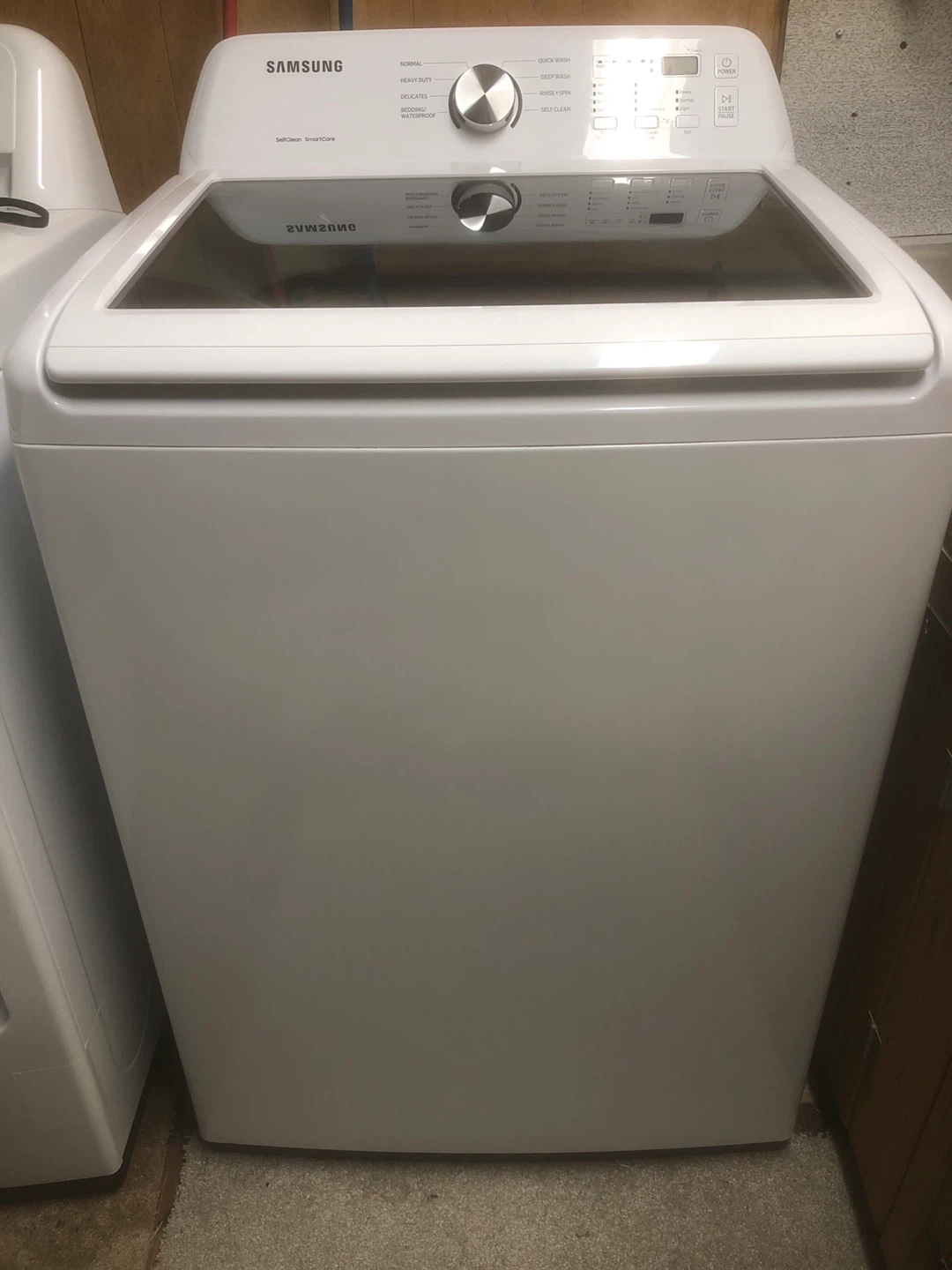 Selling a Samsung top load washer in great condition. It's white and features several wash cycles including normal, heavy duty, delicates, and a quick wash setting. It also has a self-clean function for easy maintenance. A reliable appliance for your laundry needs!