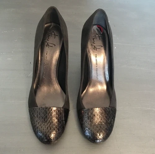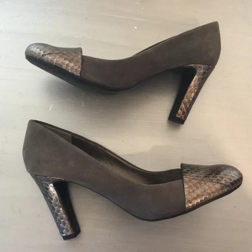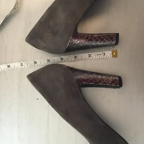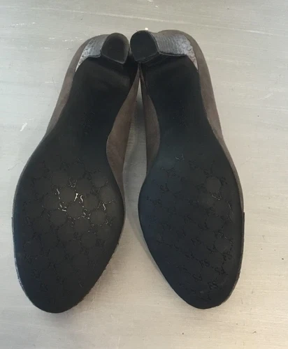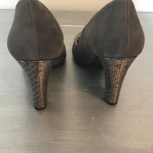 Franco Sarto Gray Suede Pumps with Pewter Snake Print on Heel and Toe