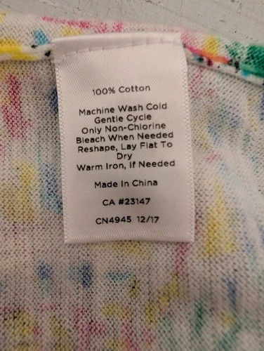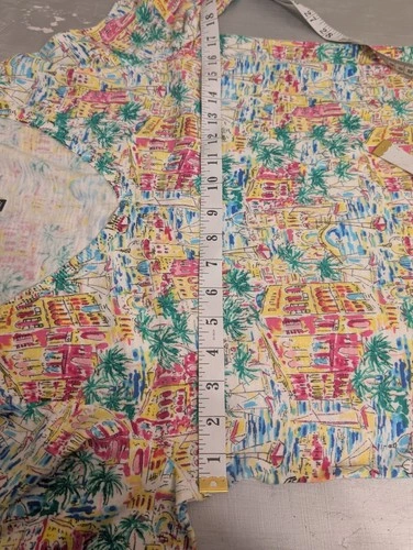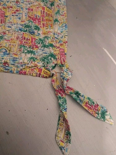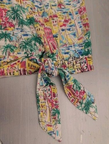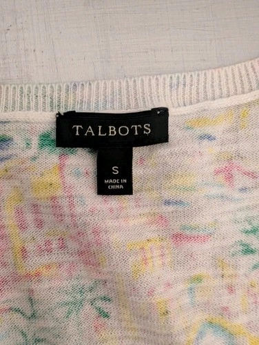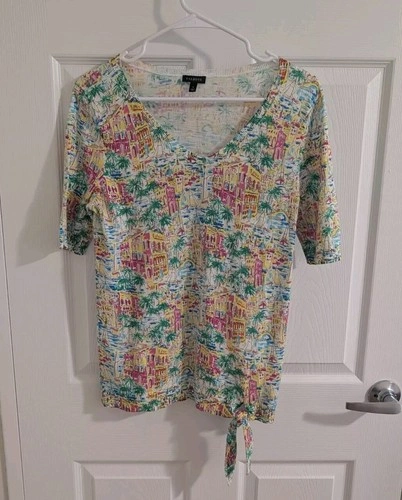 From Talbots comes this great lightweight sweater in a size S . This is a cityscape scene. The colors are pink, green, blue and yellow. There is a tie detail on the lower front. V neck.