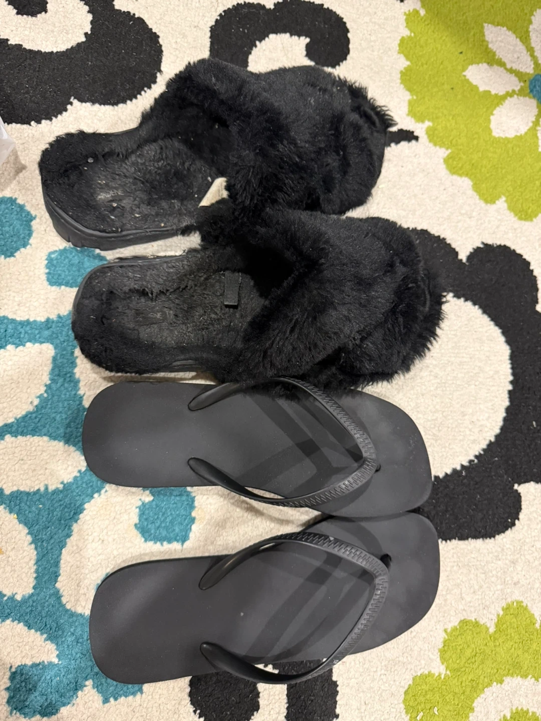 Selling a pair of fuzzy black slippers and a pair of black flip flops. Both are in used condition and have signs of wear.