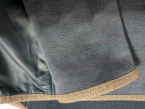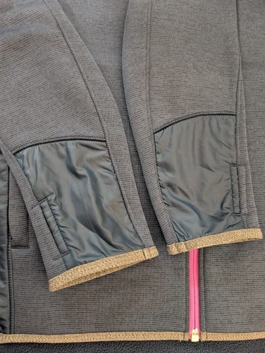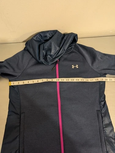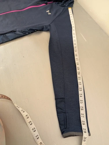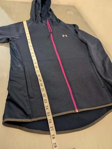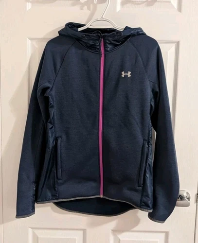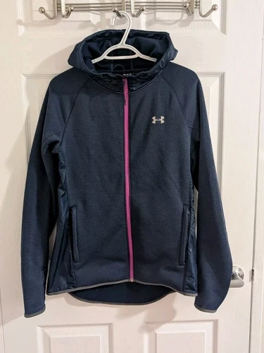 Under Armour full zip jacket with hood. Women’s size Medium. Great for fall or spring weather, very warm. Fleece lining. Has holes for thumbs. Navy blue with a pink trim. Excellent condition.