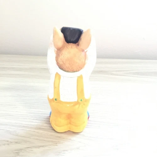 Capture the charm of this cute bunny figurine! This whimsical rabbit is dressed in yellow overalls, a white shirt with red buttons, and bright blue shoes, holding a camera above its head as if taking a picture. Perfect for collectors of bunny figurines, photographers, or lovers of unique home decor.