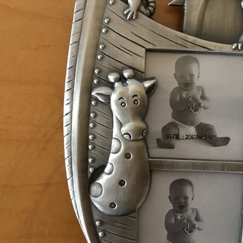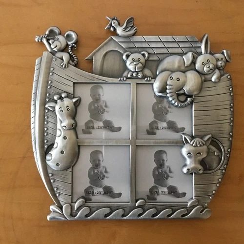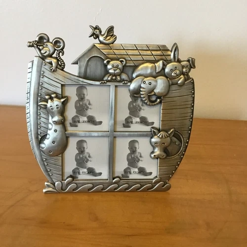 Vintage pewter children's photo frame with various animals (giraffe, horse, bear, elephant, rabbit, mouse, and bird) and four photo sections. It dates from the early 1990s. It stands on a black velvet leg at the back and measures 19.5cm high and 20cm wide. The overall photo size is 5 inches x 5 inches (or 2.5 x 2.5 inches for each four photos). (please view images and Zoom). This would make a lovely gift or frame for those special family photographs. I accept reasonable offers. I appreciate you stopping by! Enjoy your day.