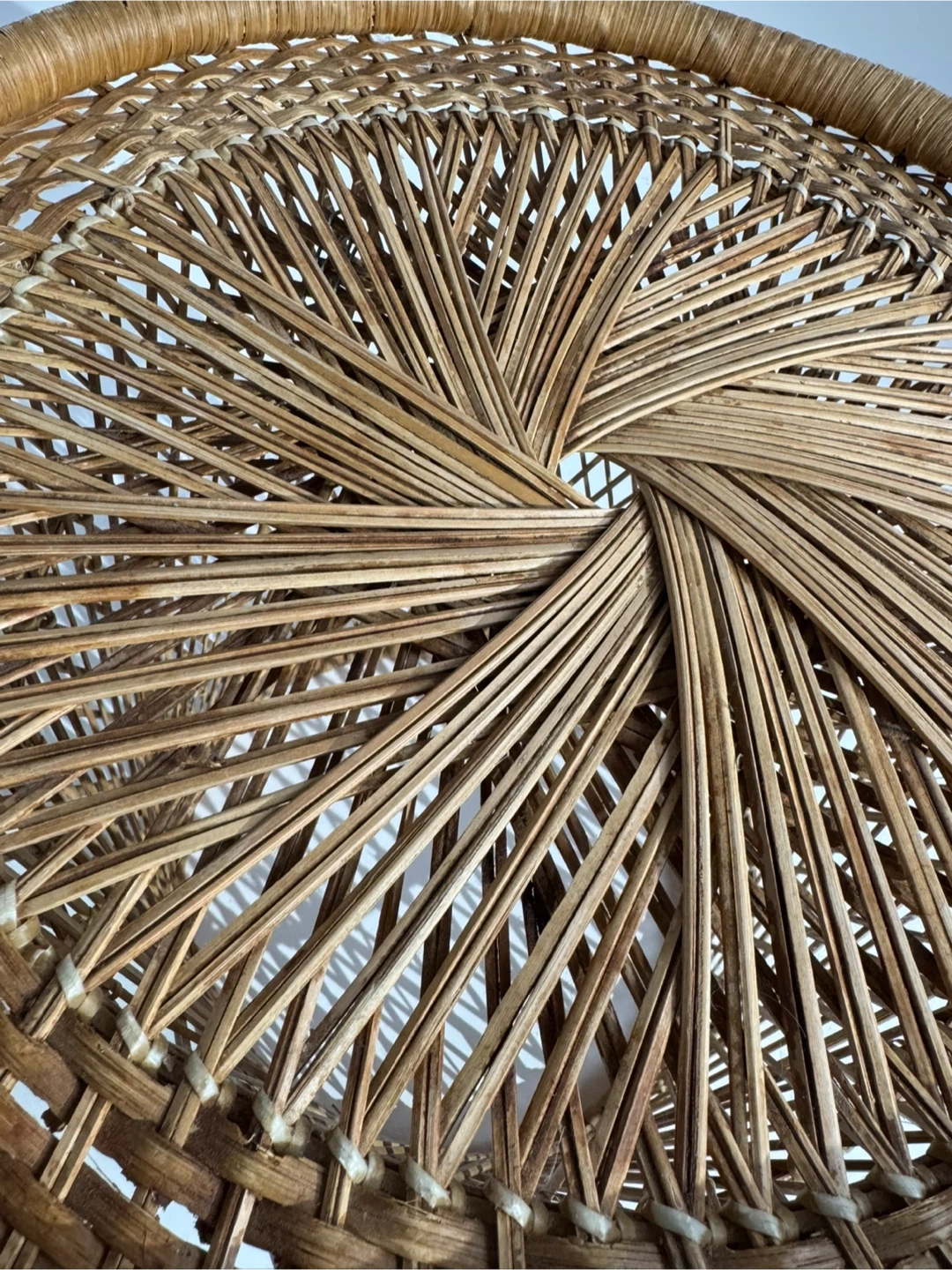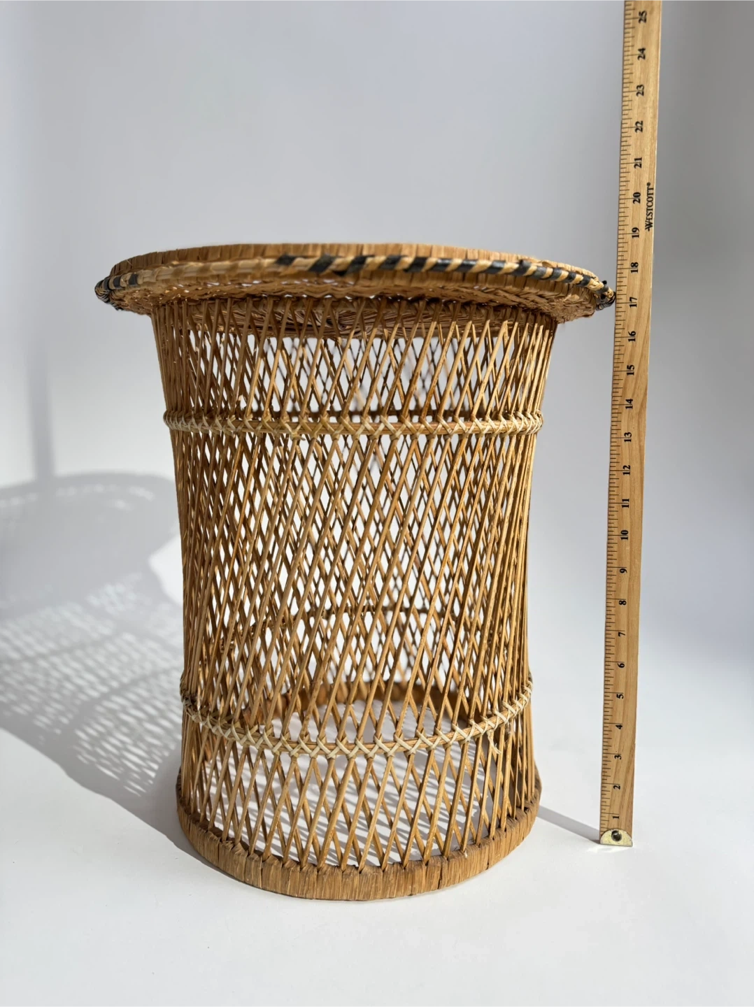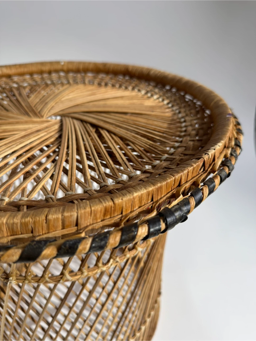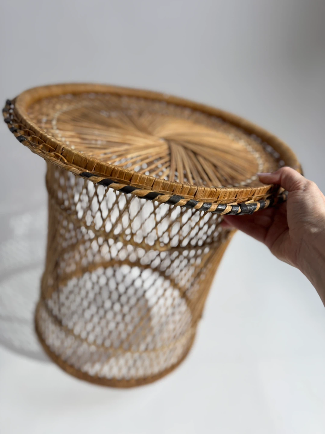 Fabulous vintage woven rattan drum side table. Ready to use. Ideal side table, plant stand or accent table or pair with peacock chair for full boho vibes…Perfect in a living room or bedroom.