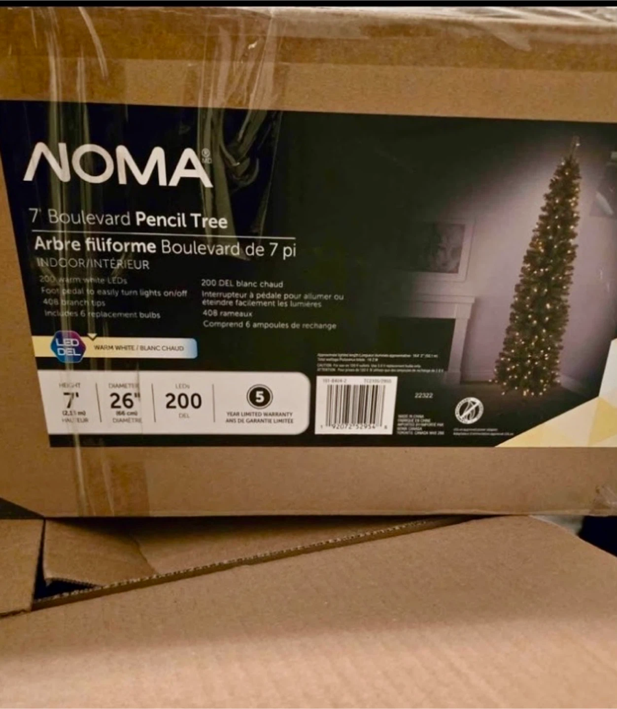 Selling a NOMA 7' Boulevard Pencil Tree. It's in great condition and comes with the box! It features 200 warm white LEDs, a foot pedal to easily turn the lights on and off, and 408 branch tips. It also includes 6 replacement bulbs. Very pretty tree for small places.