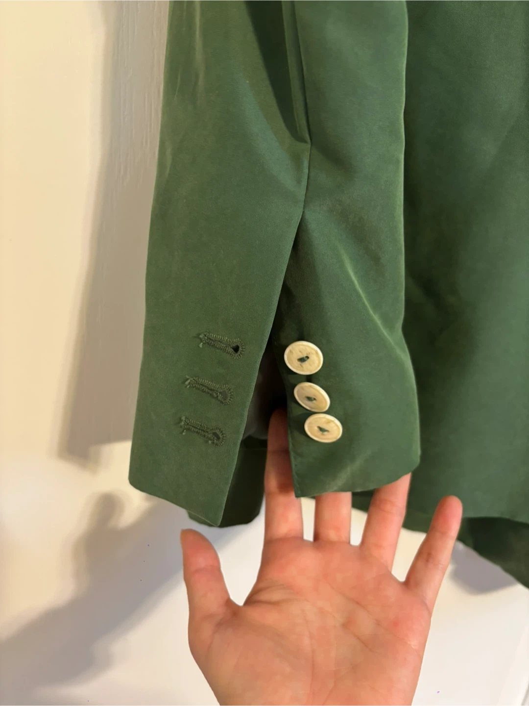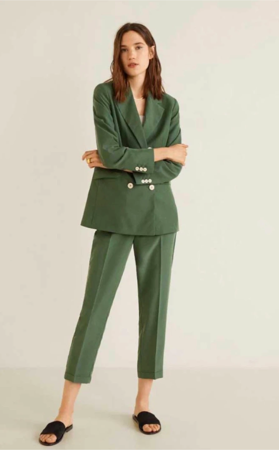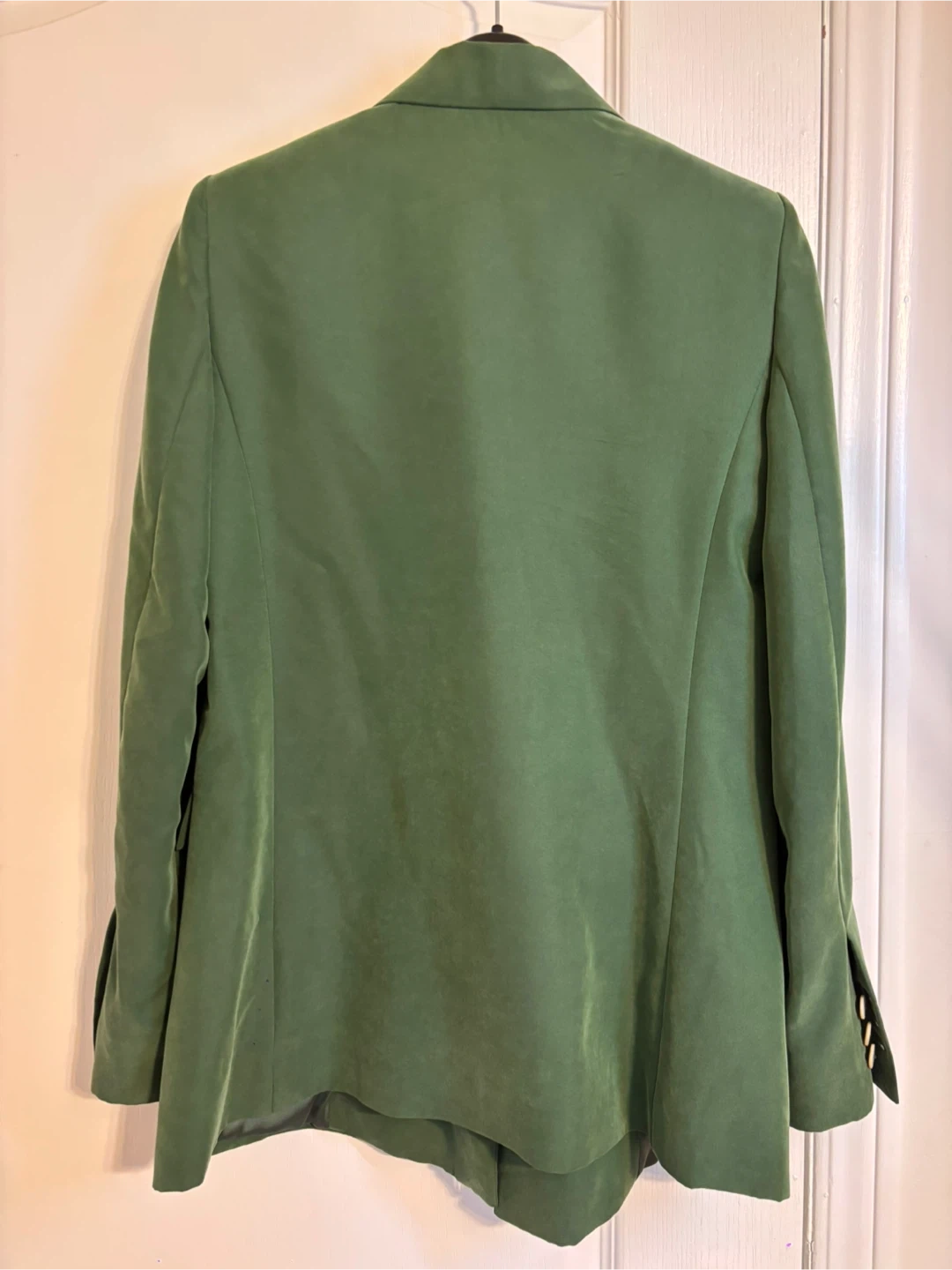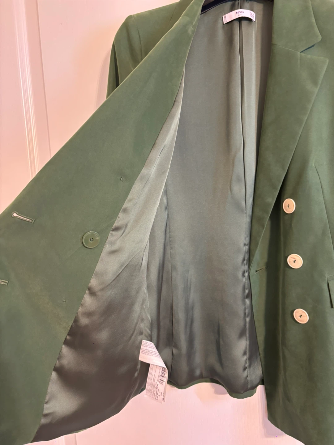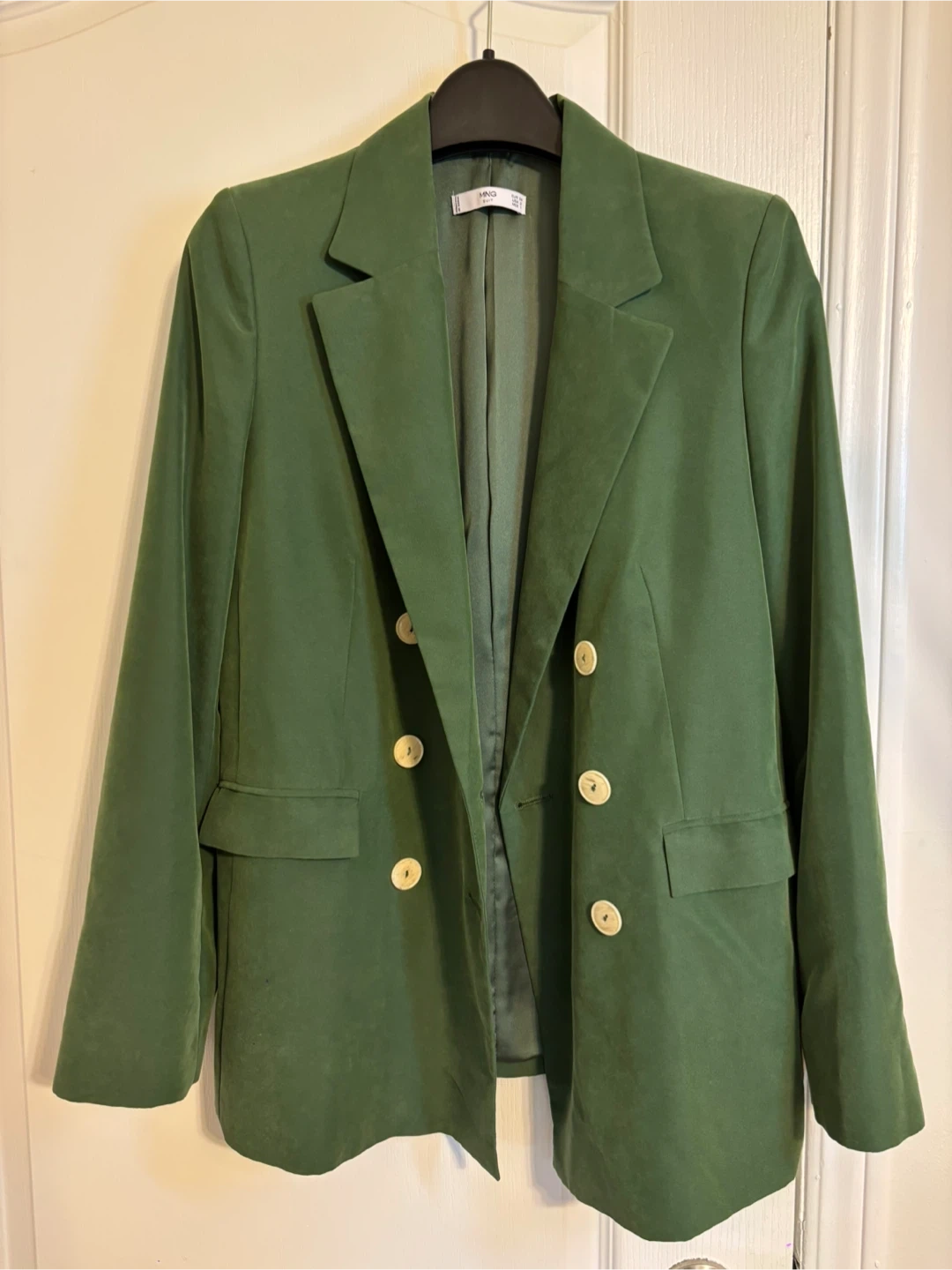 This is a beautiful green velvet blazer from Mango! It's in excellent condition and features a double-breasted design with cream-colored buttons. Perfect for adding a touch of sophistication to any outfit!