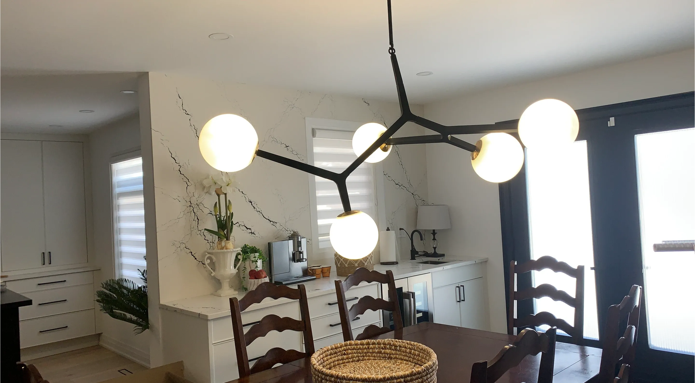 Add a touch of modern elegance to your dining room with this stylish sputnik style chandelier! The black finish and globe lights create a sophisticated look. It's in great condition and ready to brighten up your space