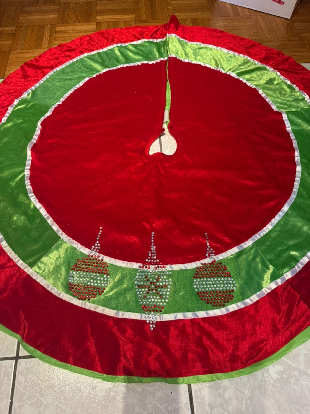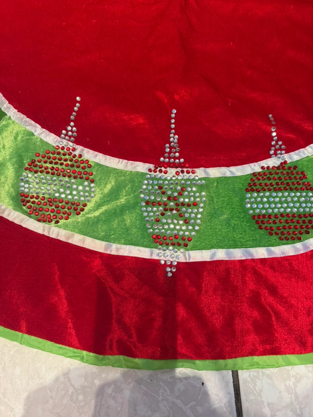 Festive velvet Christmas tree skirt in red and green! It's in great condition and ready to add some holiday cheer to your home