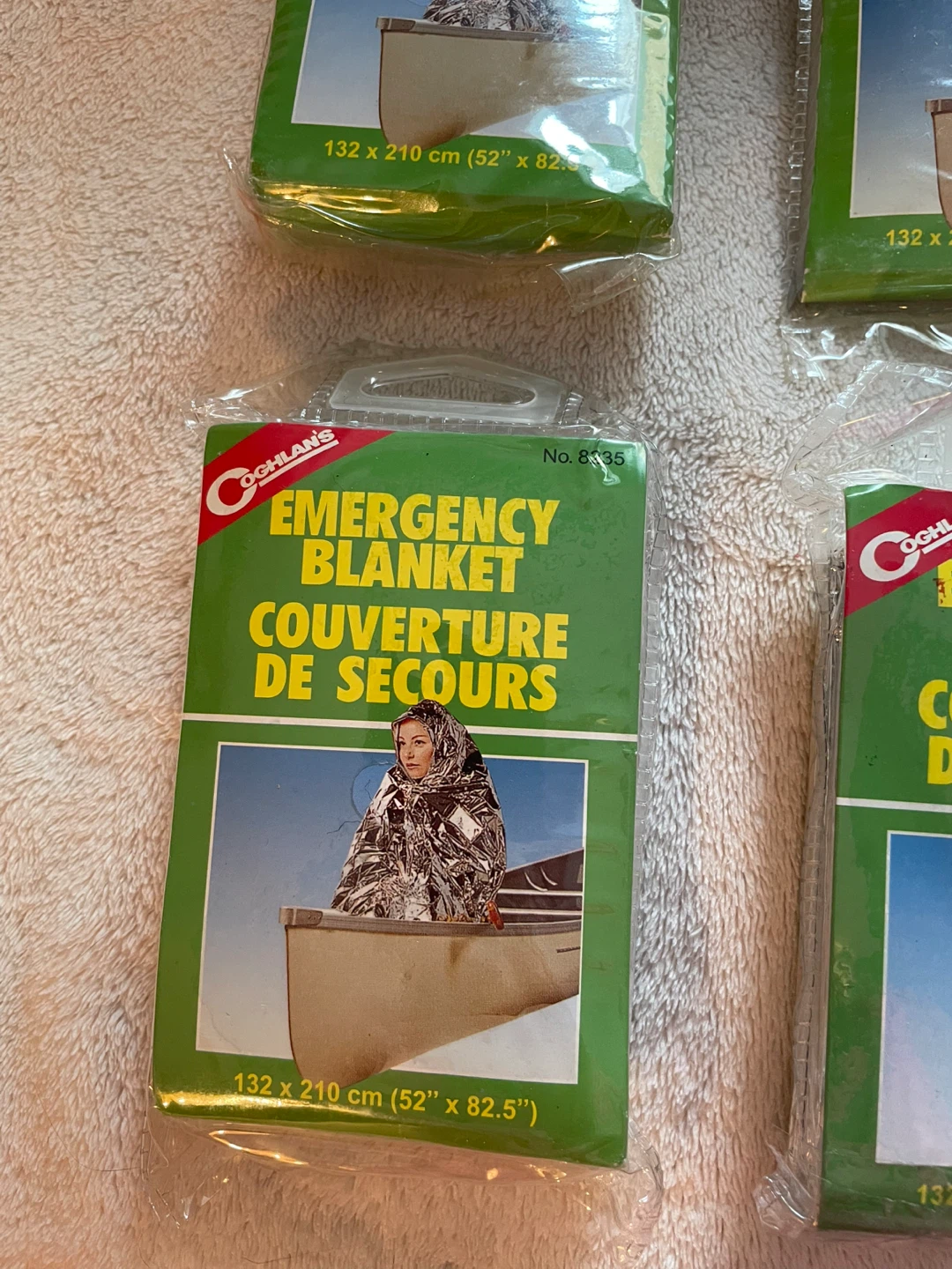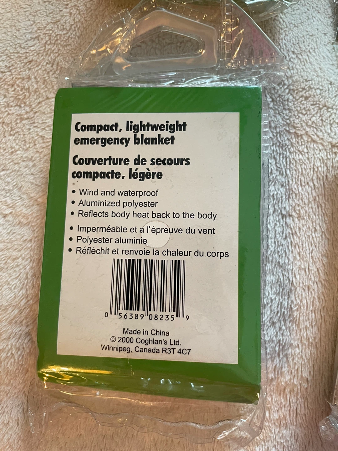 - Coghlan's Compact, lightweight emergency blanket. It's wind and waterproof, made of aluminized polyester and reflects body heat back to the body. Size is 132 x 210 cm (52" x 82.5") (4)