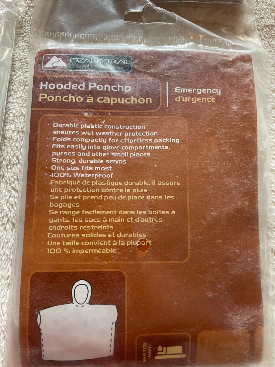 - Ozark Trail Hooded Poncho, durable plastic construction ensures wet weather protection. (4) one is missing from photo