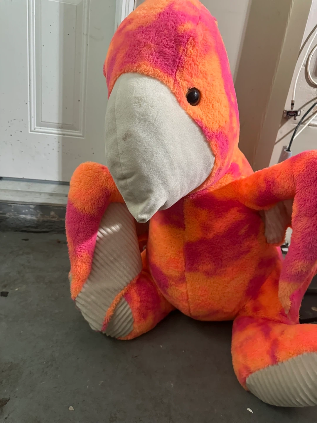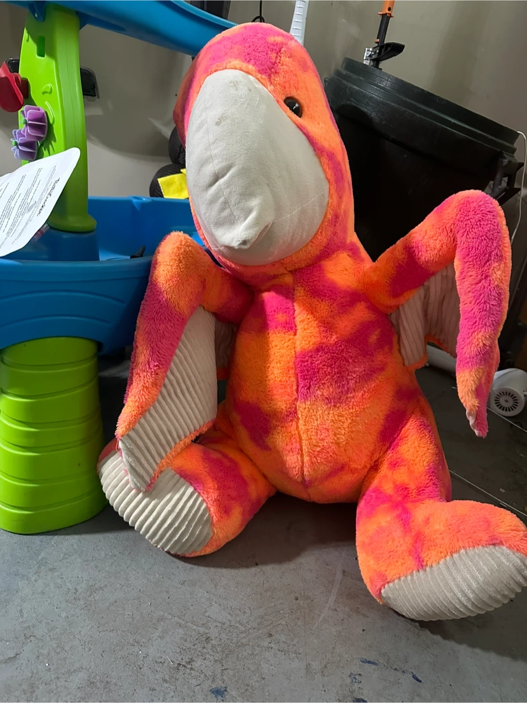 This is a cute plush toy from Dinosaur Train! It looks like a Pteranodon with orange and pink tie dye fur. It's in good condition and ready for a new home with a Dinosaur Train fan