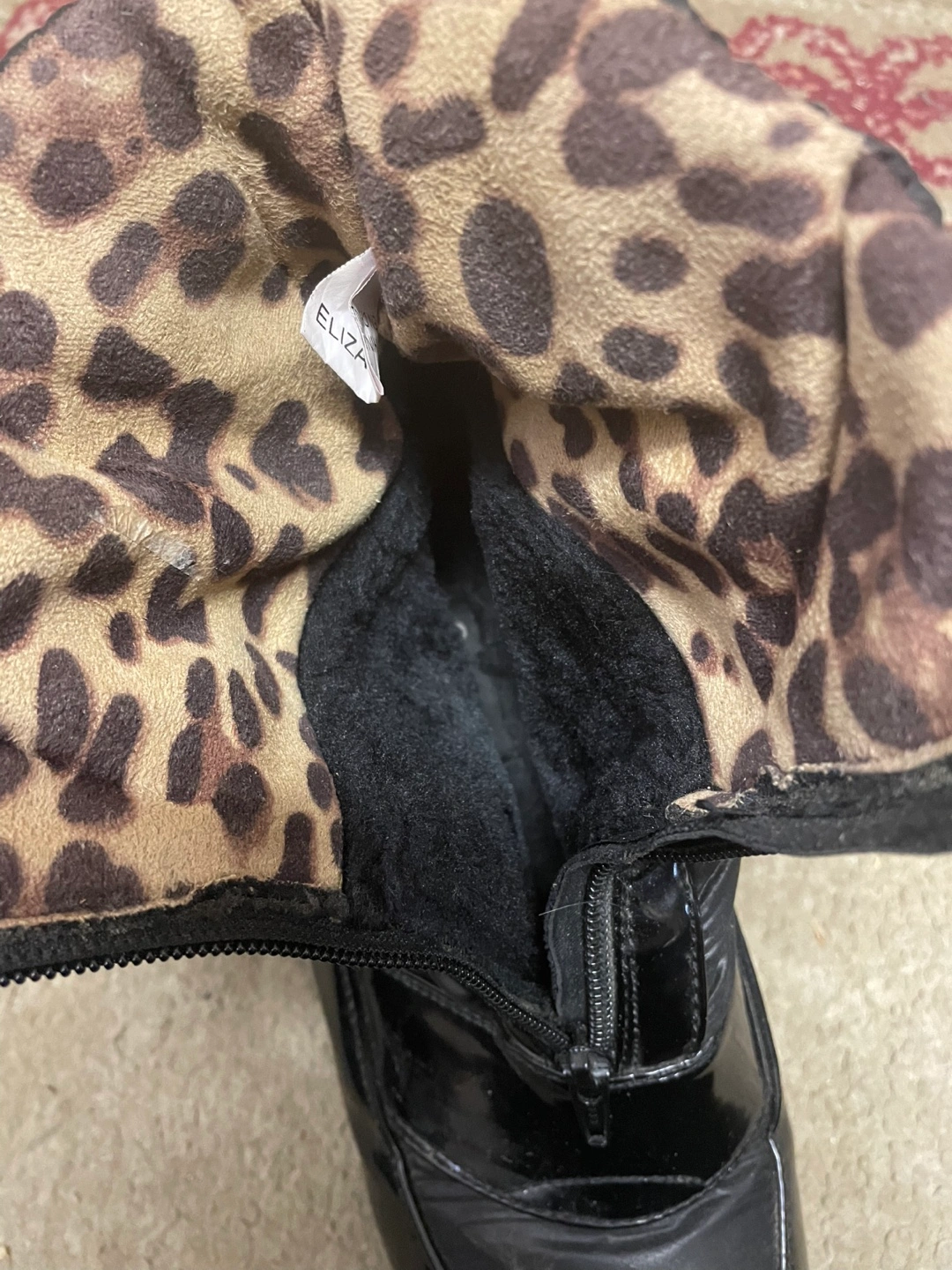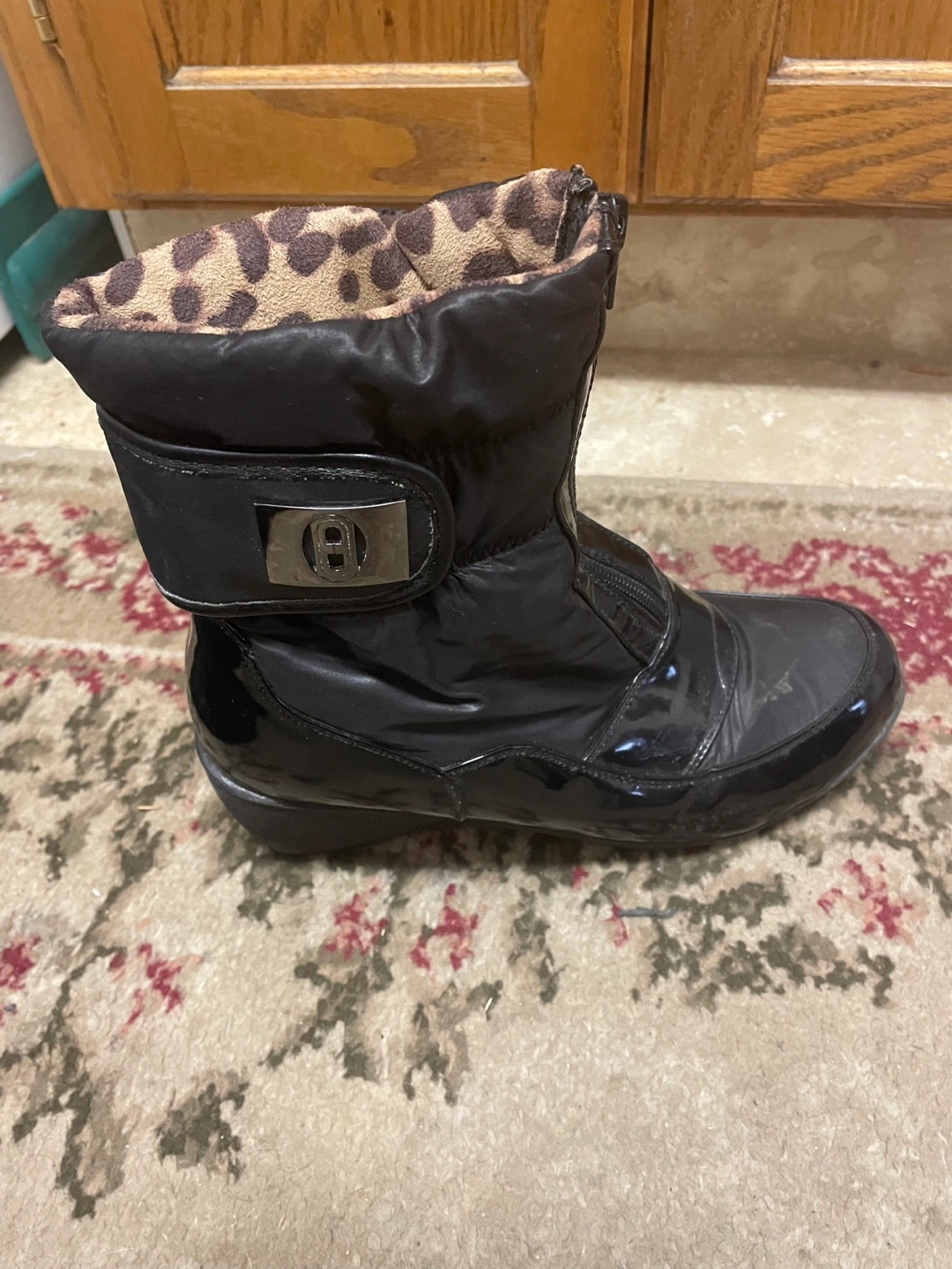 Cute Eliza B black womens size 8 winter boots with a fun leopard print lining! These are perfect for keeping your feet warm and stylish during the colder months. They feature a front zipper and a buckle on the side still in good condition been used cash only please no e-transfers