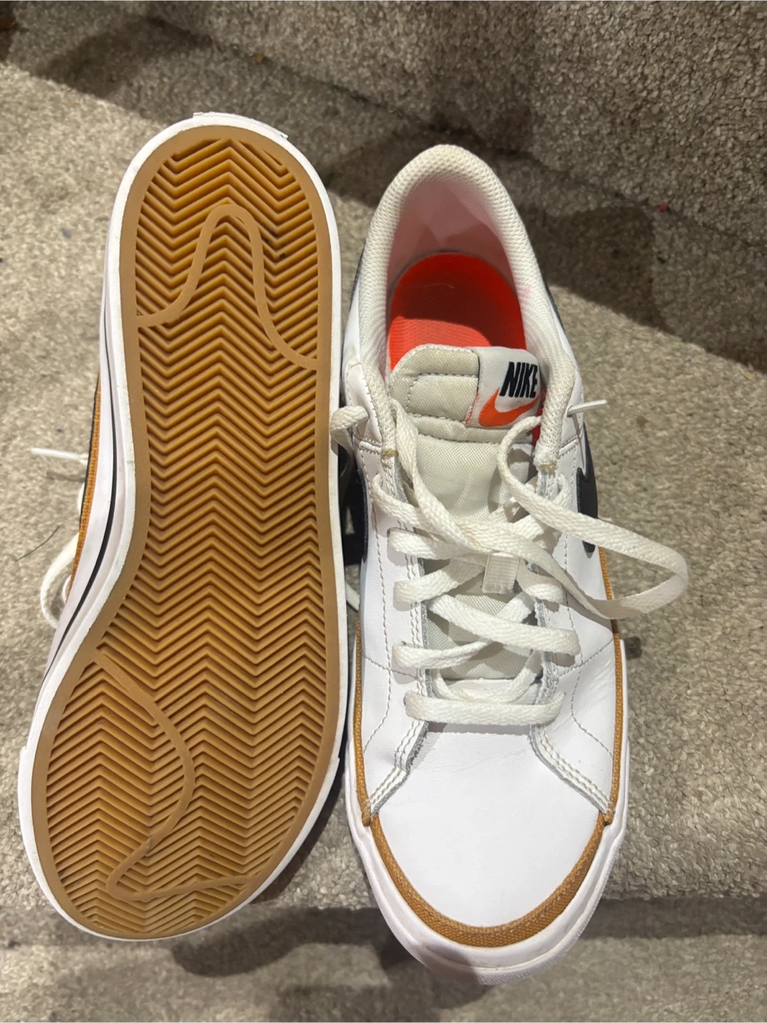 Selling a pair of Nike Court Legacy shoes in size 6.5 They're white with a brown trim and the classic Nike swoosh. Great for everyday wear.