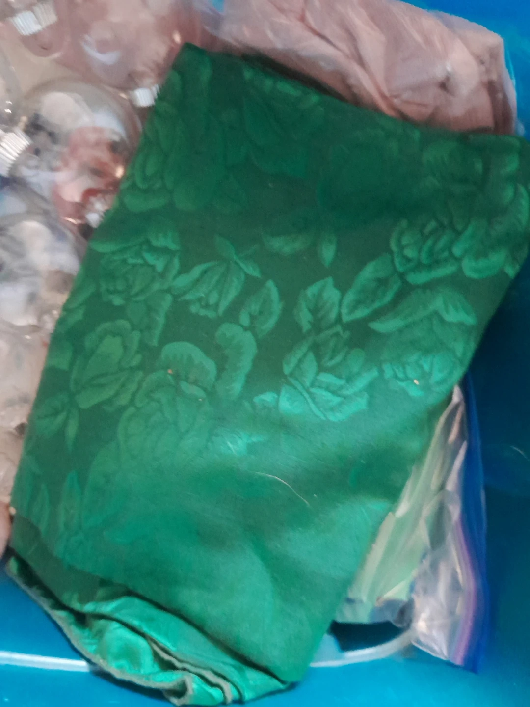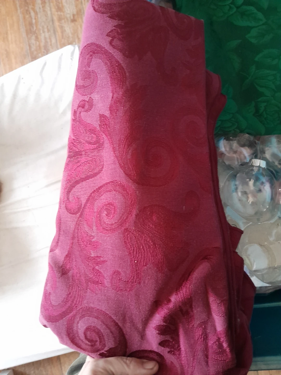 I'm selling table cloths in red and green. The red fabric has a lovely swirl pattern, and the green fabric has a floral design