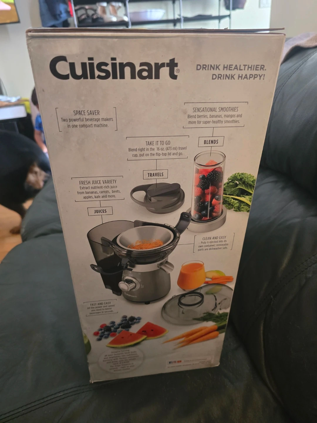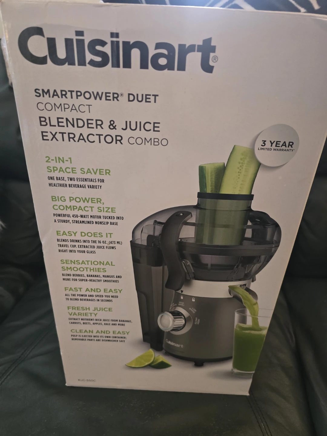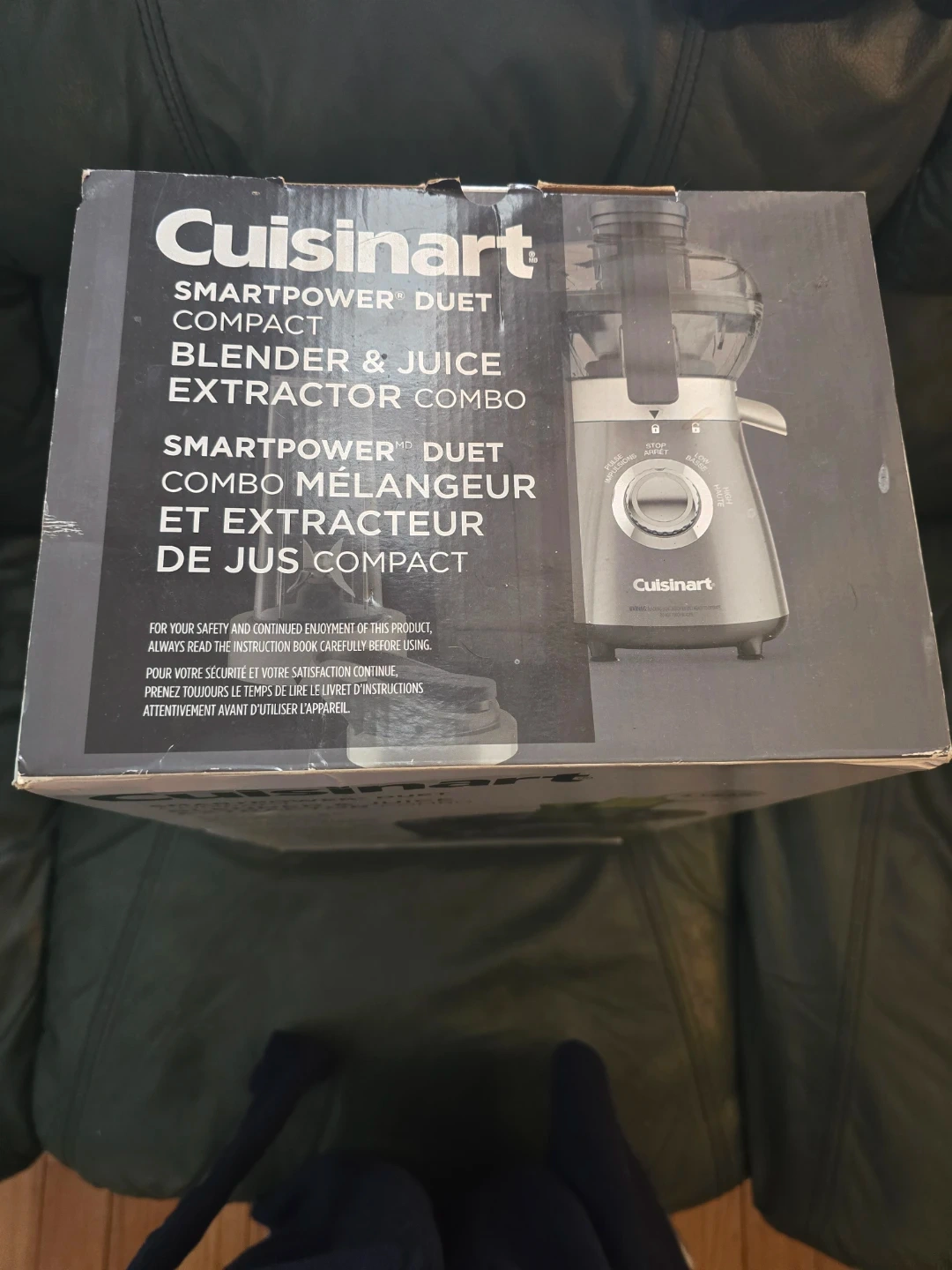 Selling a brand new Cuisinart SmartPower Duet Compact Blender & Juice Extractor Combo! It's a 2-in-1 space saver with one base for healthier beverage variety. It has a powerful 450-watt motor tucked into a sturdy, streamlined non-slip base. It's easy to use and blends drinks into the 16 oz travel cup in seconds. Get sensational smoothies and fresh juice variety with this great appliance!