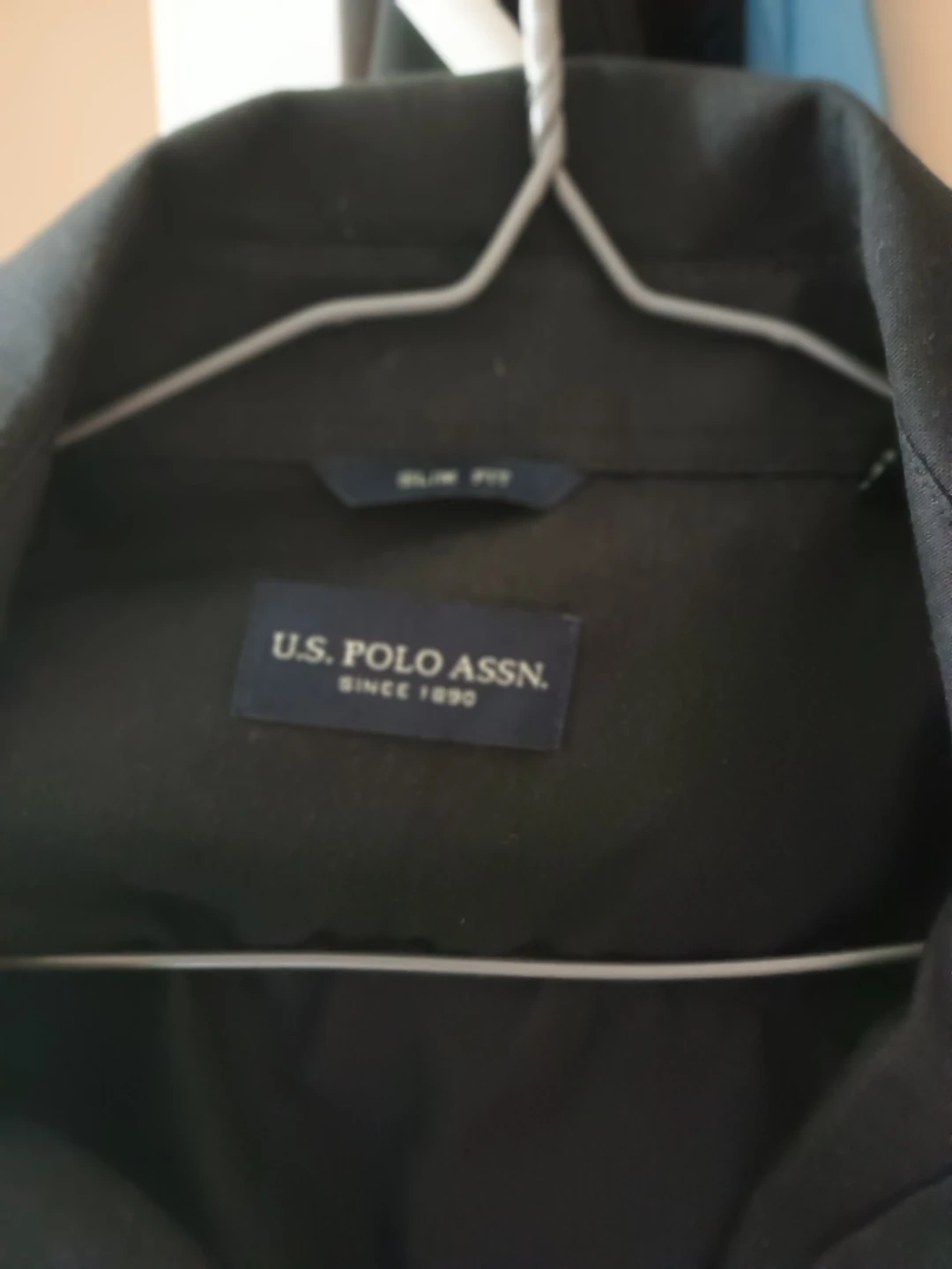 This is a U.S. Polo Assn. slim fit dress shirt in black. It's a size large with a 16-16.5 inch neck and 32/33 inch sleeve. It's a classic button-up style.