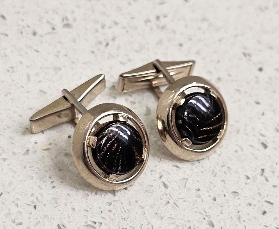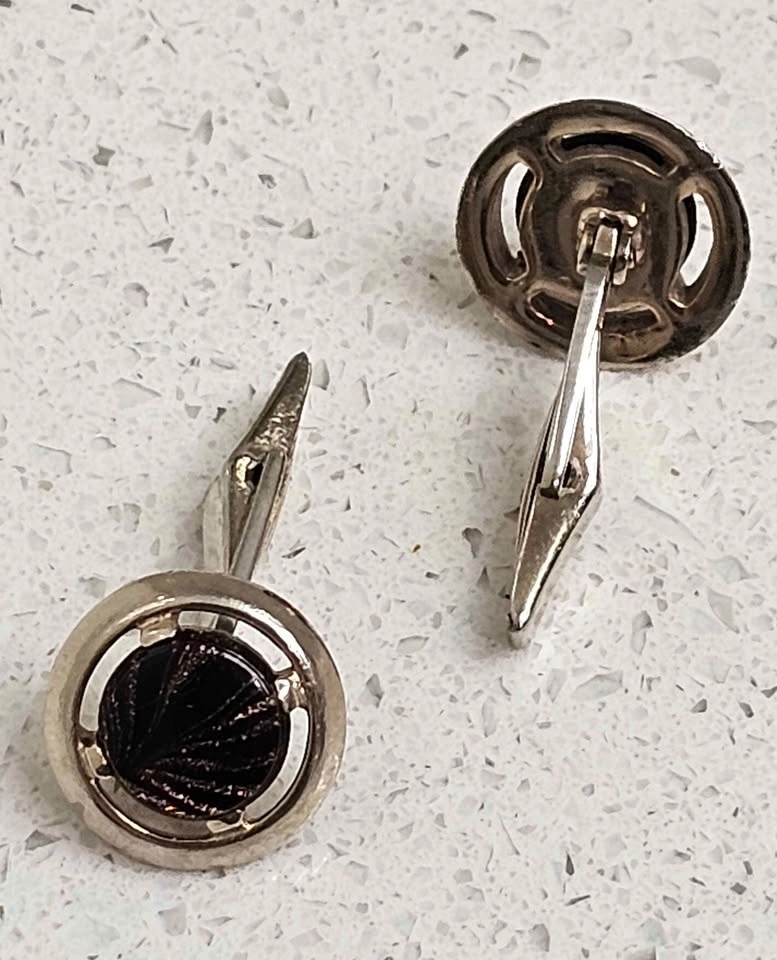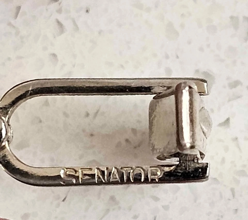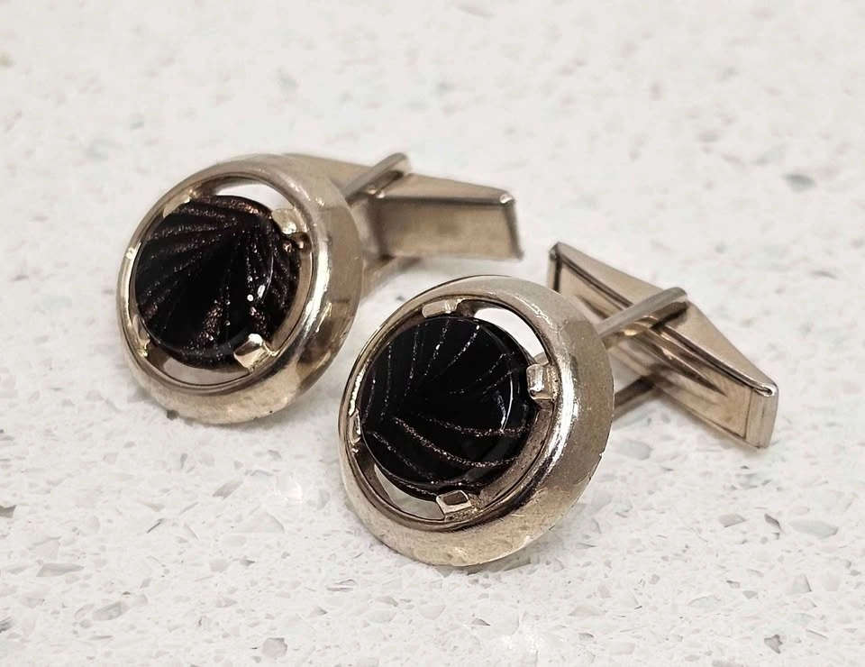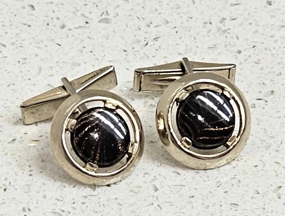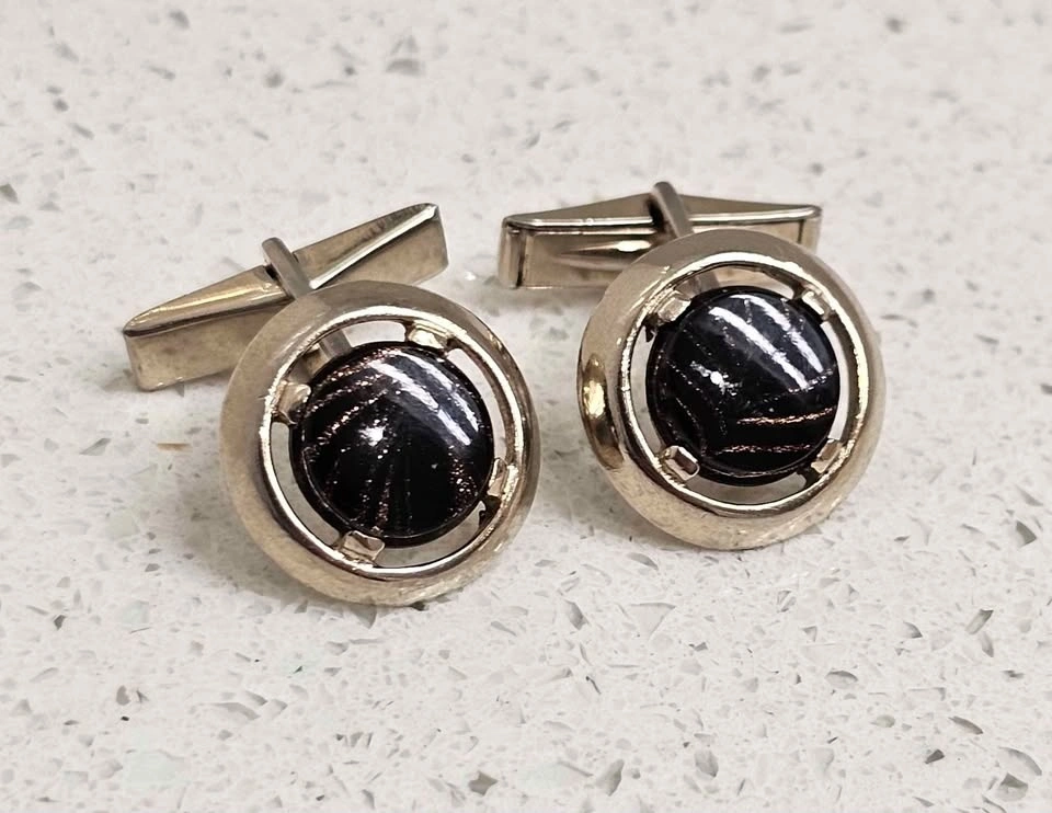 This sale is for one pair of vintage Senator gold tone cufflinks by Canadian accessories company Sherman. They feature a hinged, gold-tone circle with a nice goldstone and black detailed stone that is very reminiscent of tigers eye. There is a simple wide bezel around the stones. Closure: Bullet back toggle. Status: Vintage/Pre-owned. Condition: Very Good-Excellent. FREE PICK UP IN CALGARY ALBERTA CANADA.
