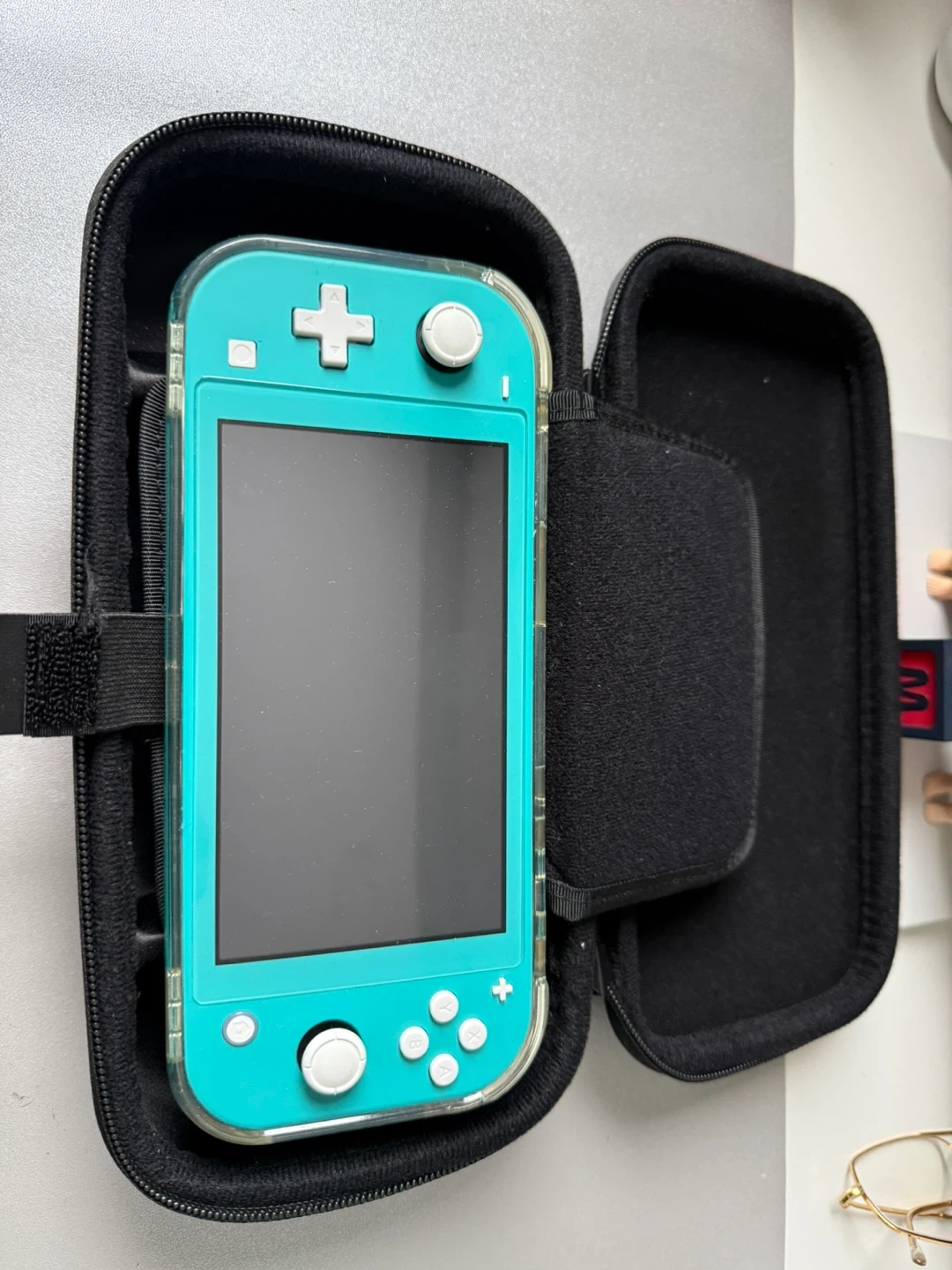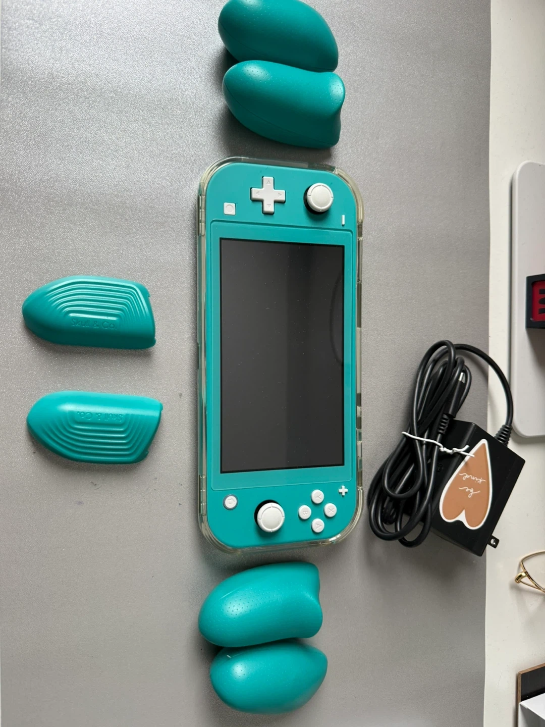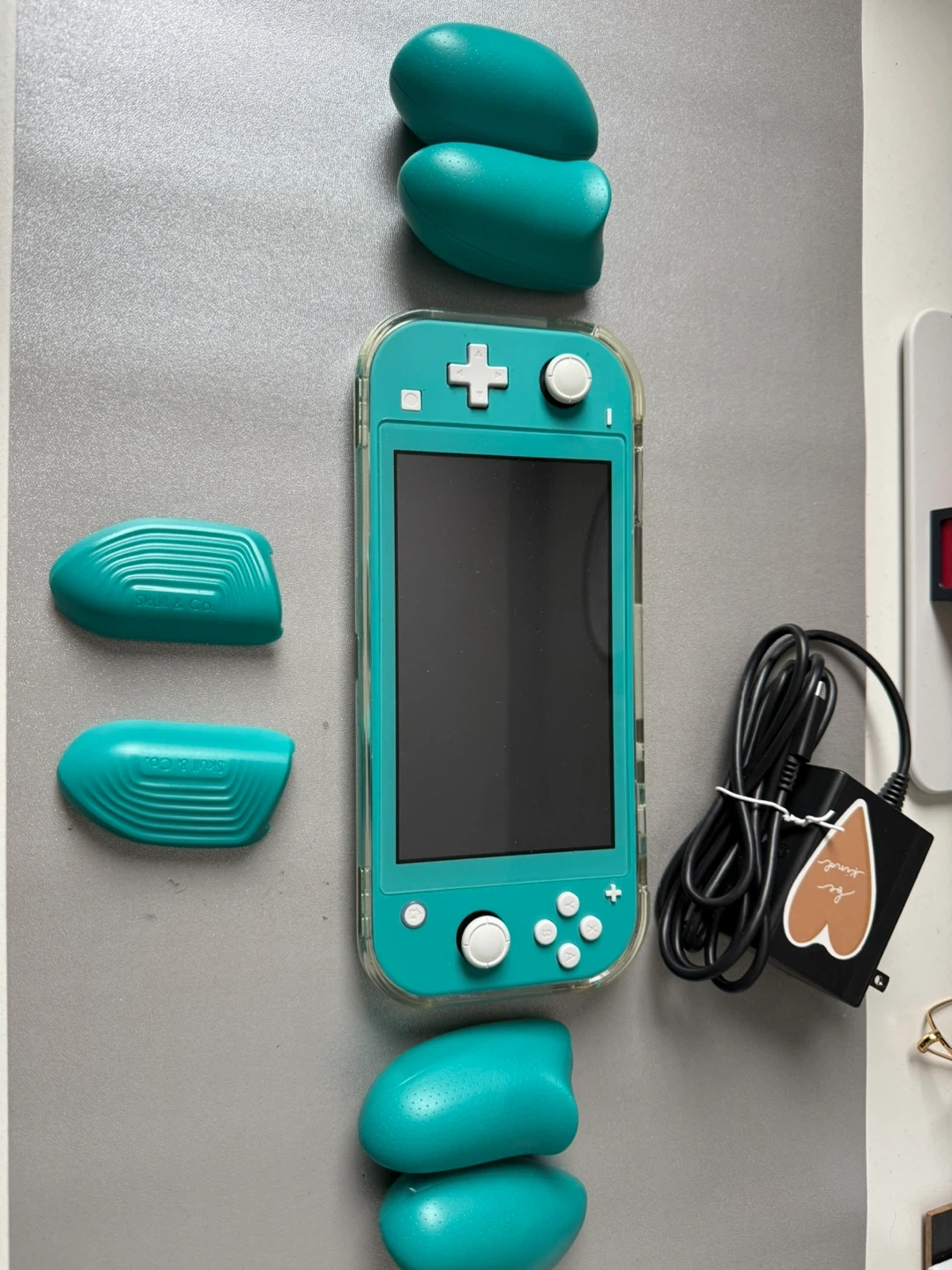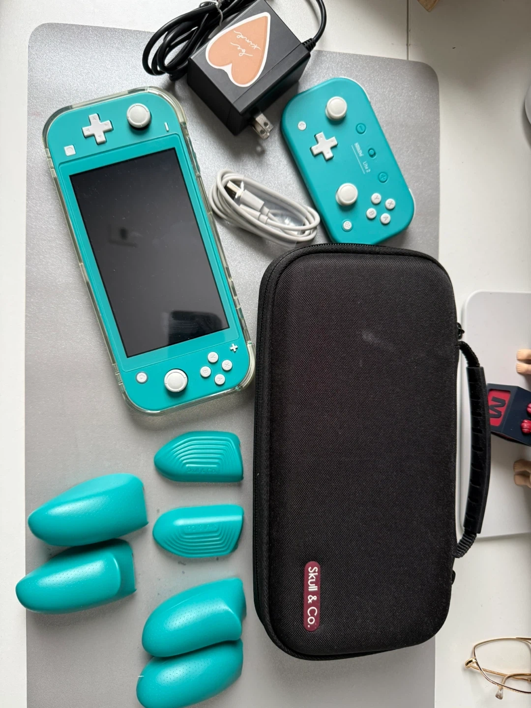 This bundle includes a turquoise Nintendo Switch Lite console, a Skull & Co. GripCase with interchangeable grips, and a USB-C charging cable. It also comes with a black protective carrying case and 8bitdo controller.