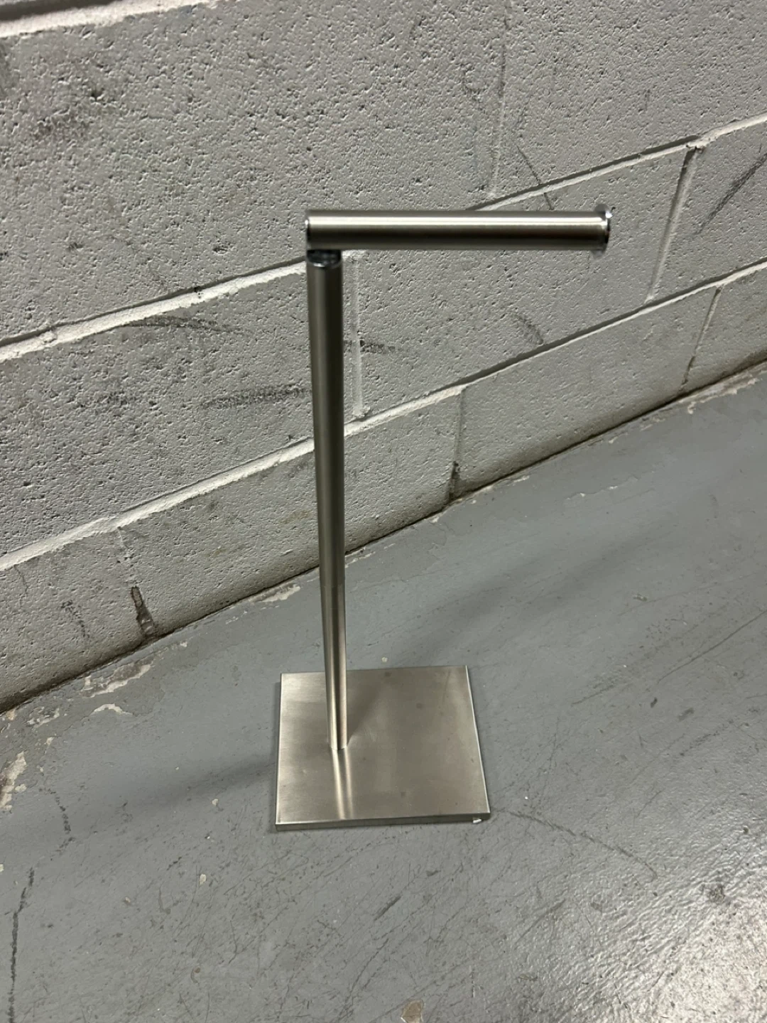 This freestanding toilet paper holder is made of brushed stainless steel. It's designed with a square base for stability. This holder is handy for bathrooms needing extra or mobile toilet paper storage.