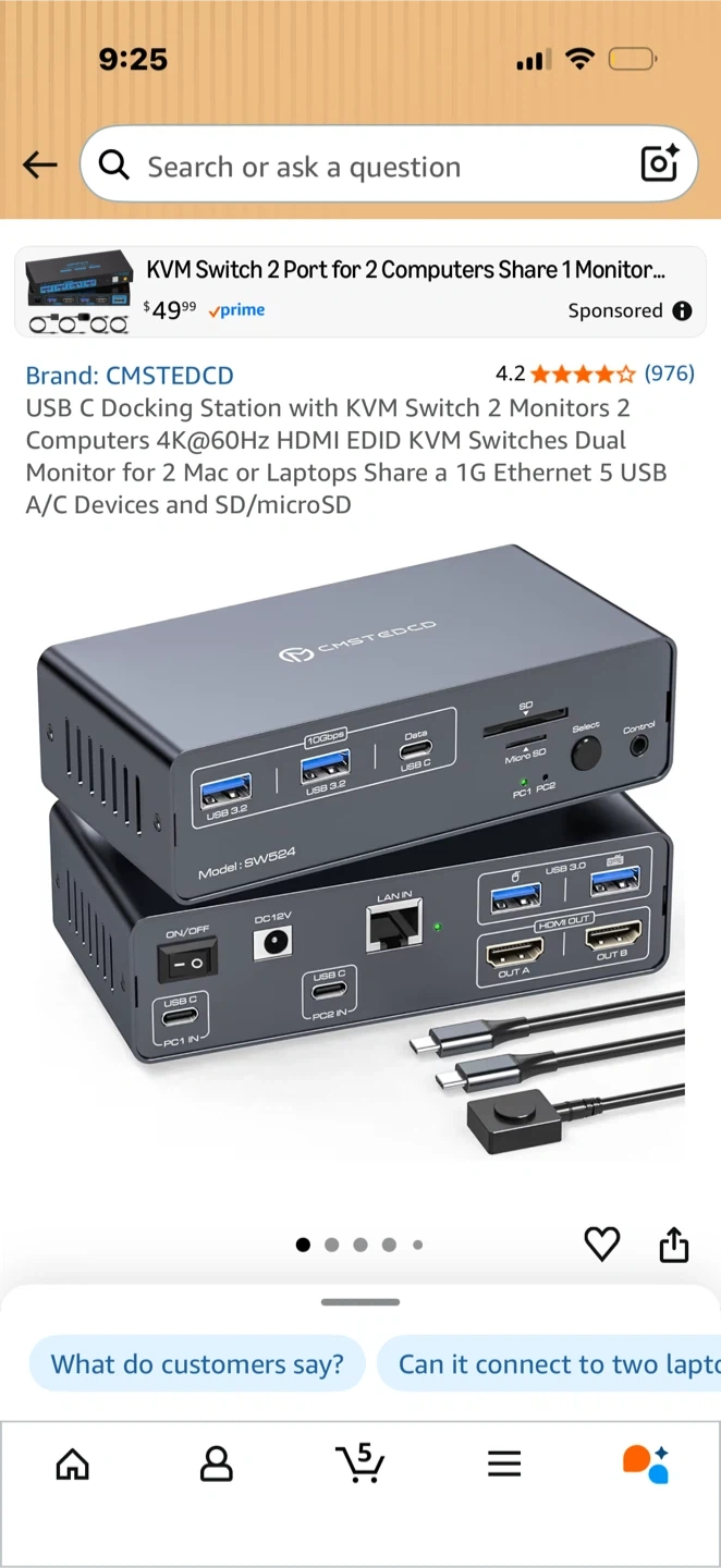 This CMSTEDCD docking station has a KVM switch for 2 computers and supports 2 monitors at 4K@60Hz. It shares 1 monitor, 1G Ethernet, and 5 USB A/C devices. Includes SD/microSD card readers and USB 3.0/3.2 ports.