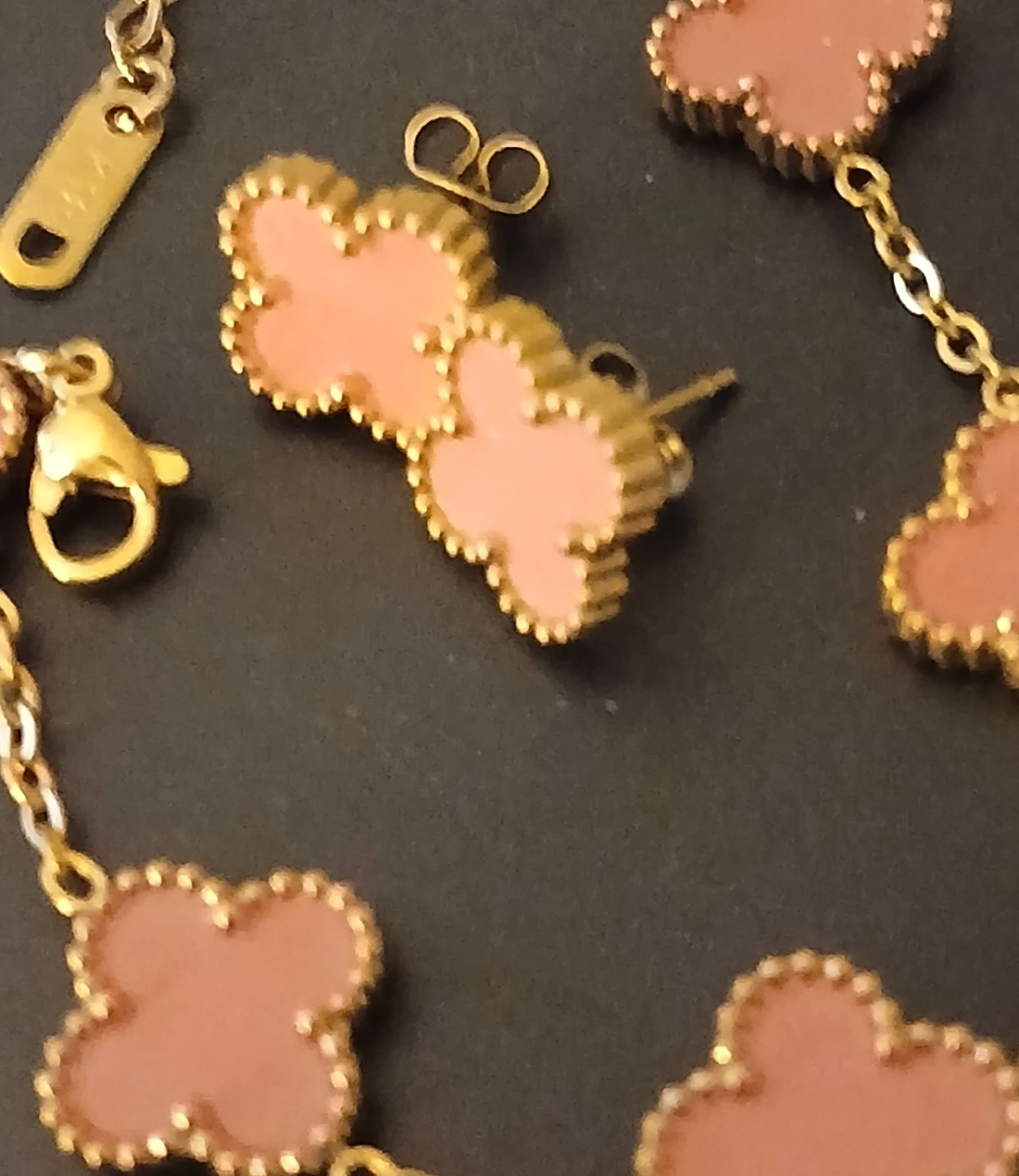Stylish gold-tone necklace and matching stud earrings set. Features a delicate chain with clover-shaped charms in a blush pink hue. Plus bracelet