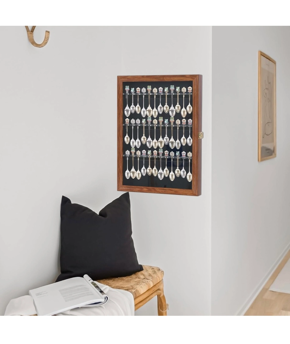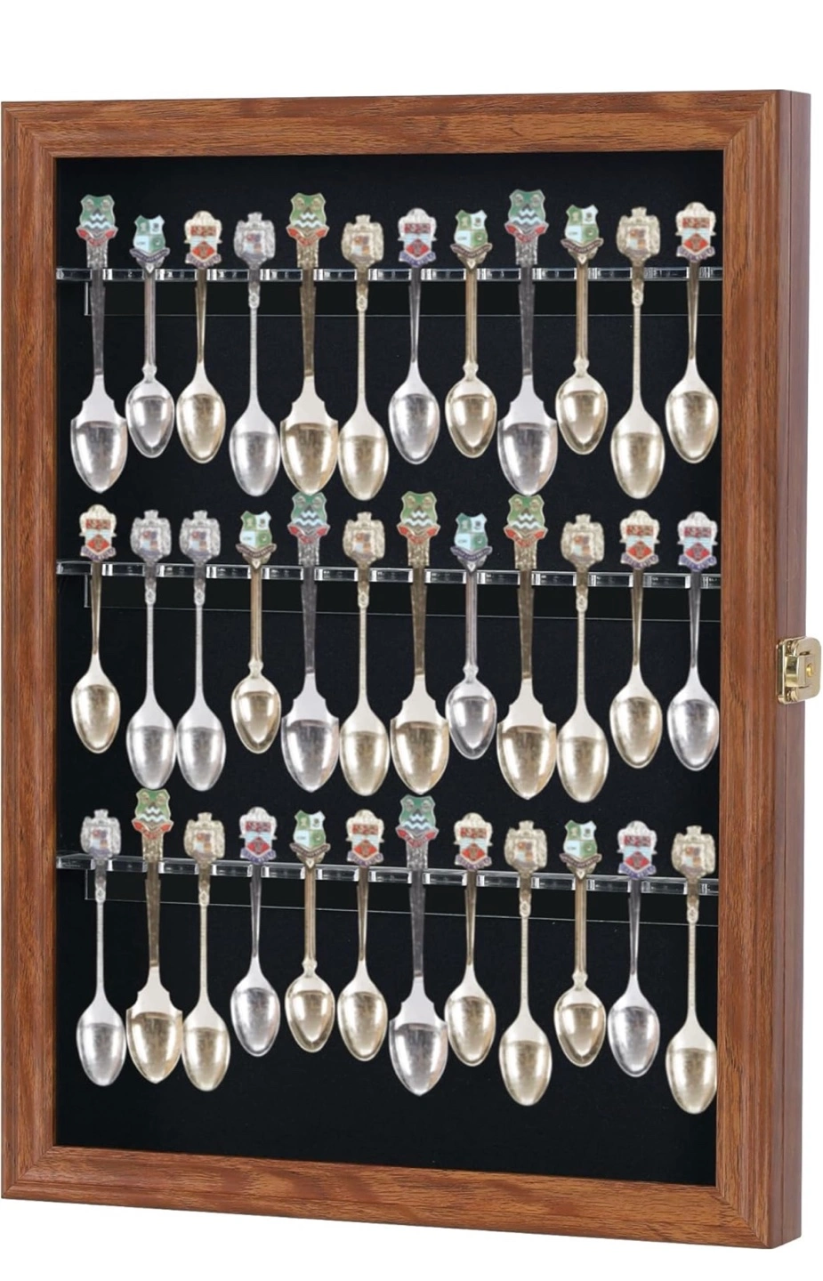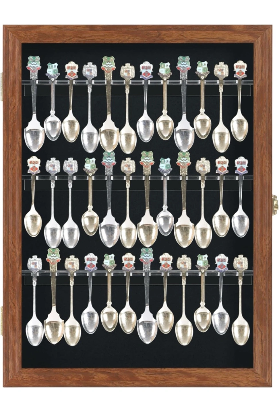 Wall-mounted display case, dark wood frame, black velvet backing. Three rows of acrylic holders. Holds approximately 36 spoons. Perfect for collectors.