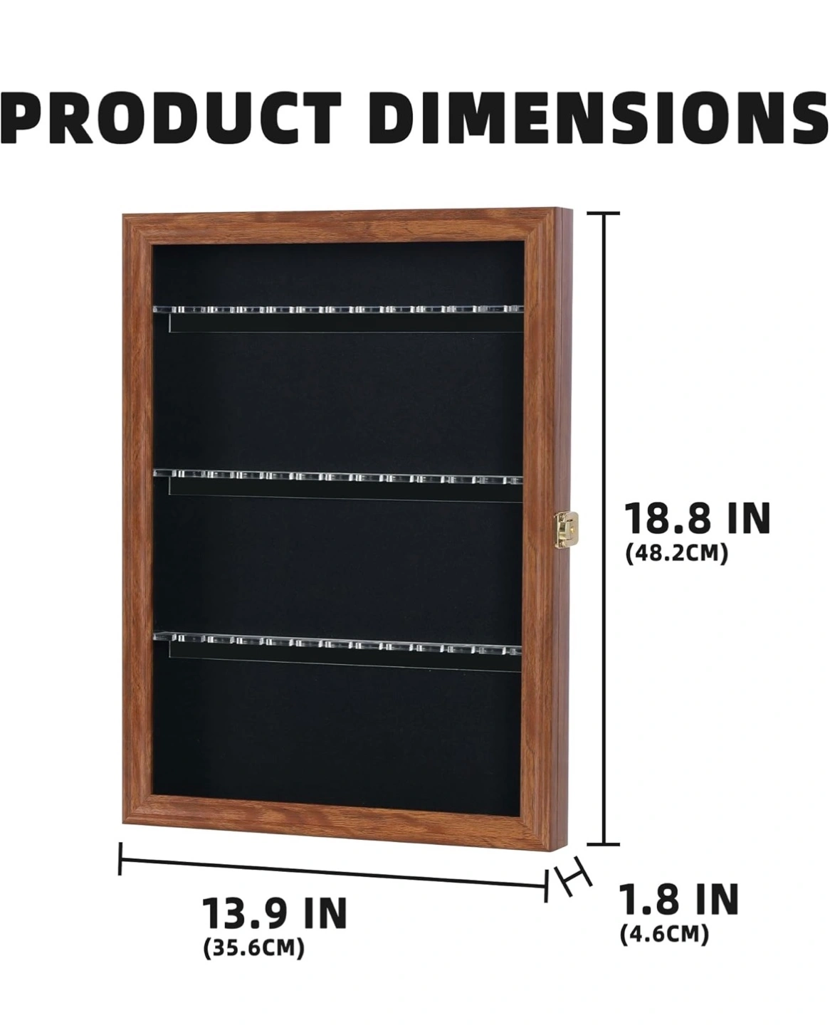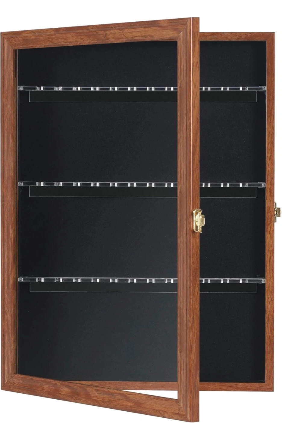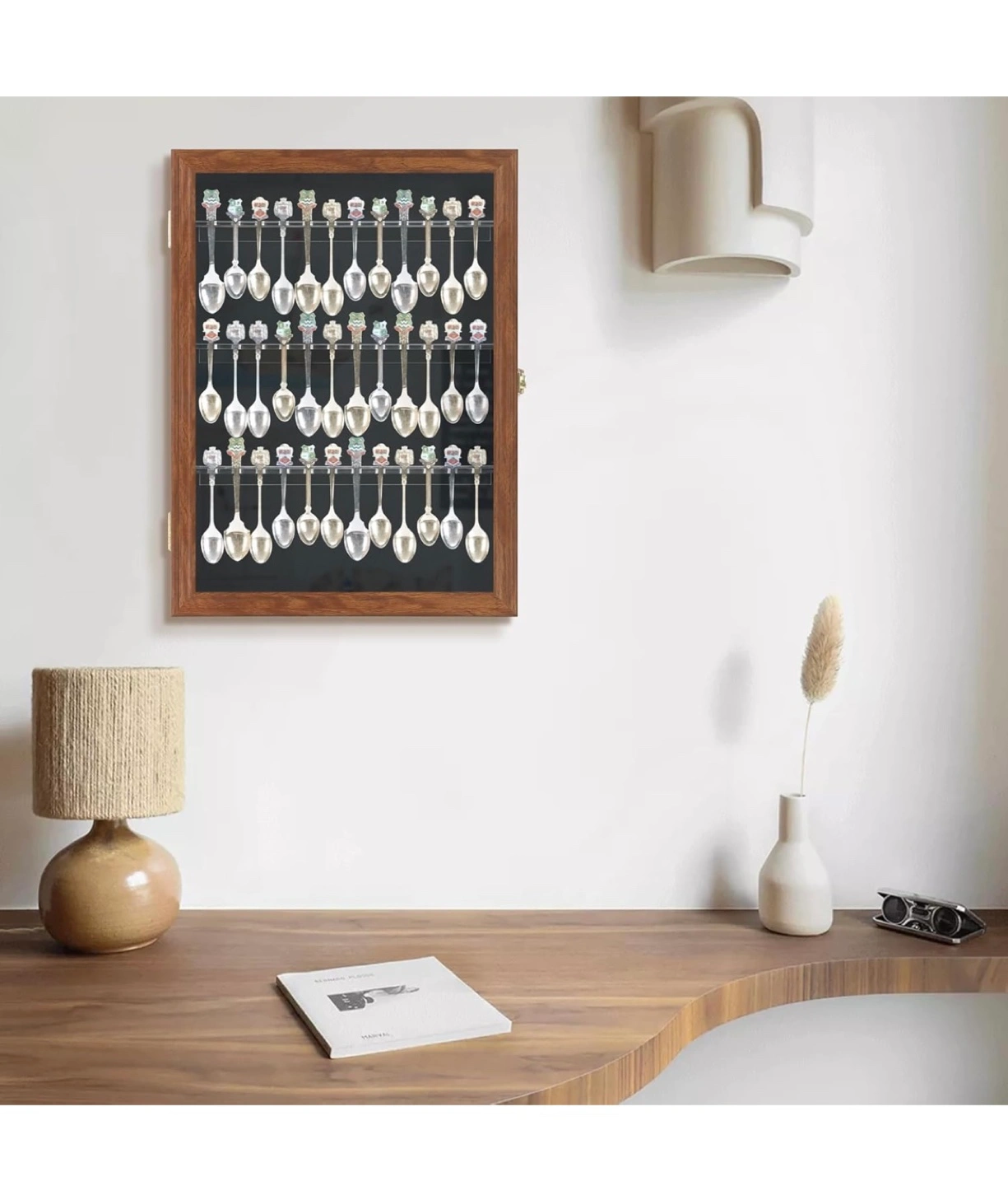 Wall-mounted display case, dark wood frame, black velvet backing. Three rows of acrylic holders. Holds approximately 36 spoons. Perfect for collectors.