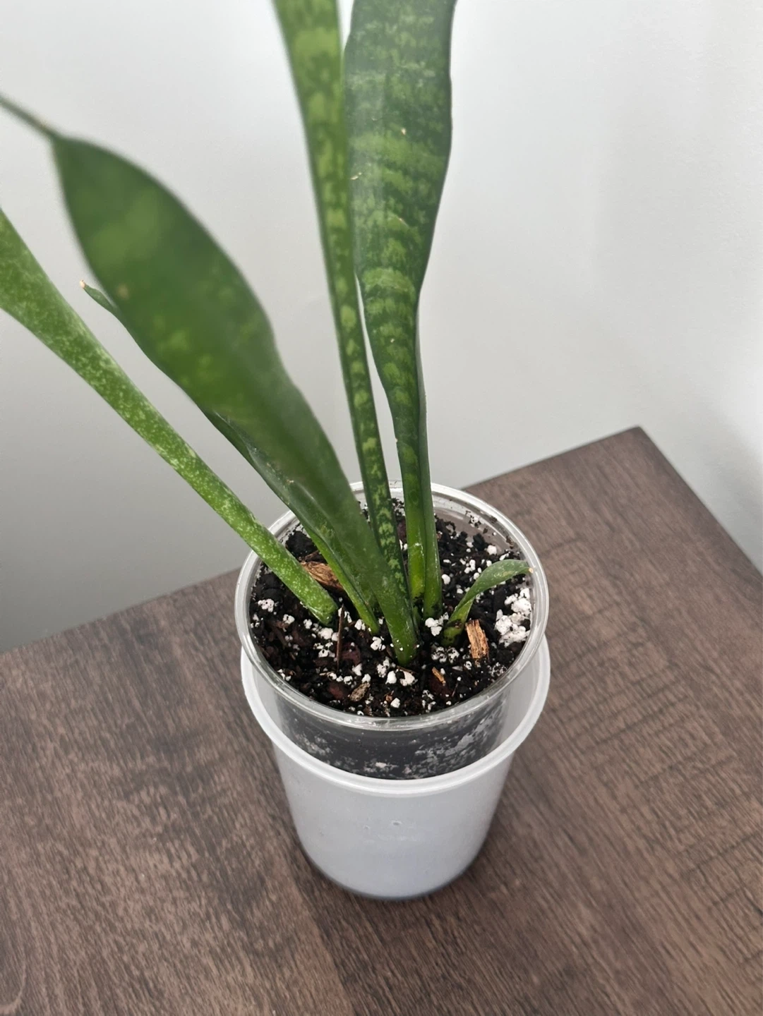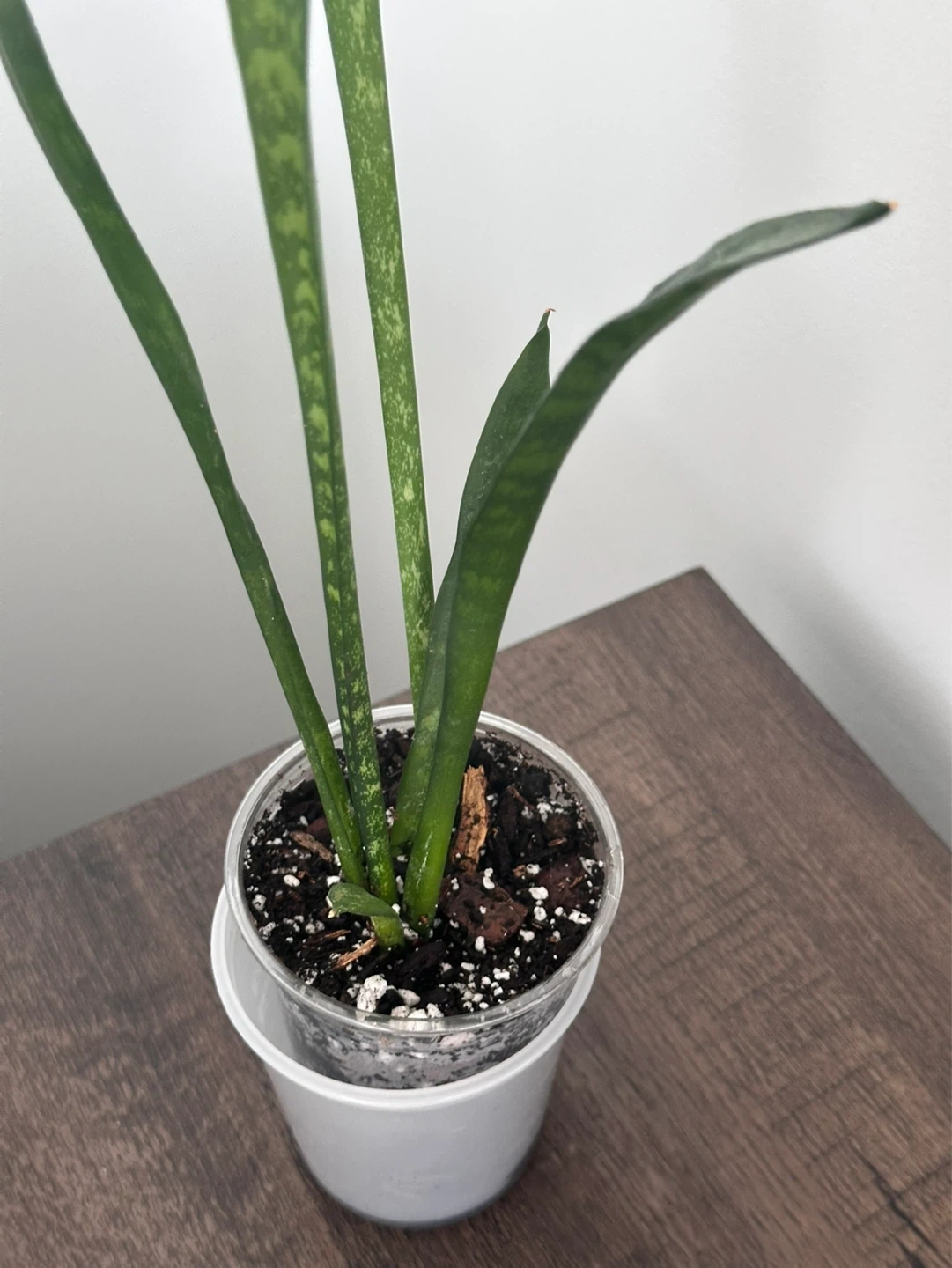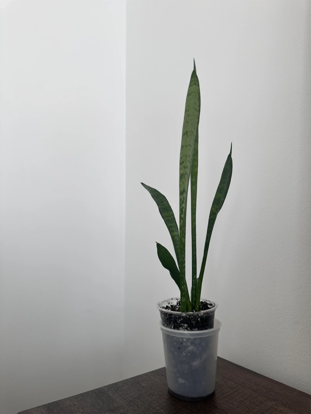 A healthy snake plant in a clear plastic pot. It's a great low-maintenance houseplant. Easy to care for and adds a touch of green to any room!