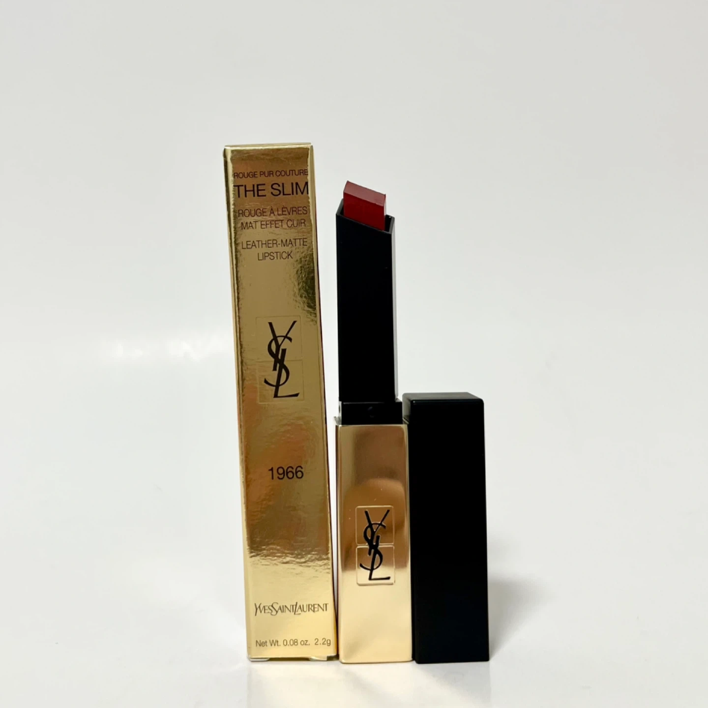 Yves Saint Laurent Rouge Pur Couture The Slim lipstick in shade 1966. It's a leather-matte finish lipstick. Net weight is 0.08 oz / 2.2g. This lipstick offers a sophisticated look for any occasion.