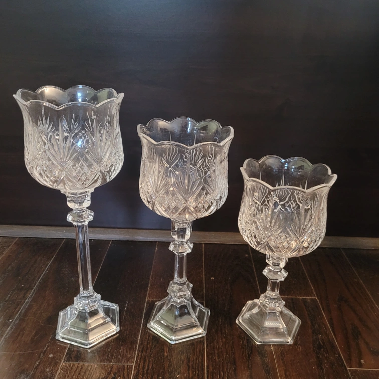 Set of 3 clear glass candle holders with cut crystal design. The tallest holder is approximately 14 inches tall.