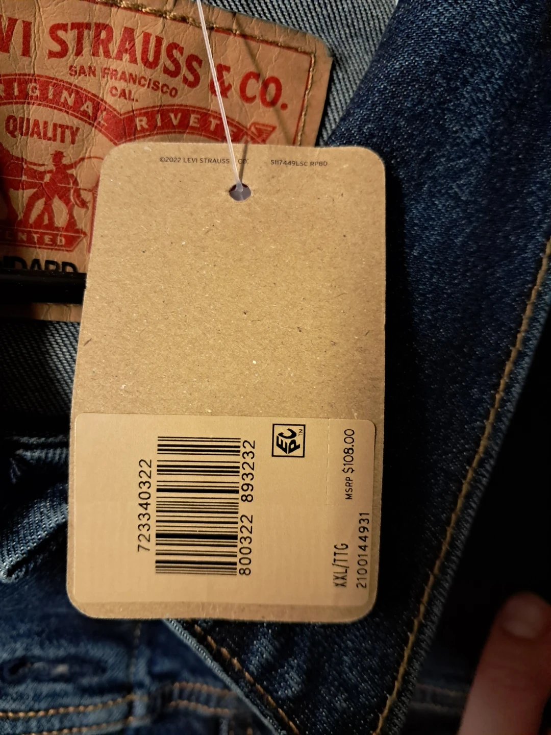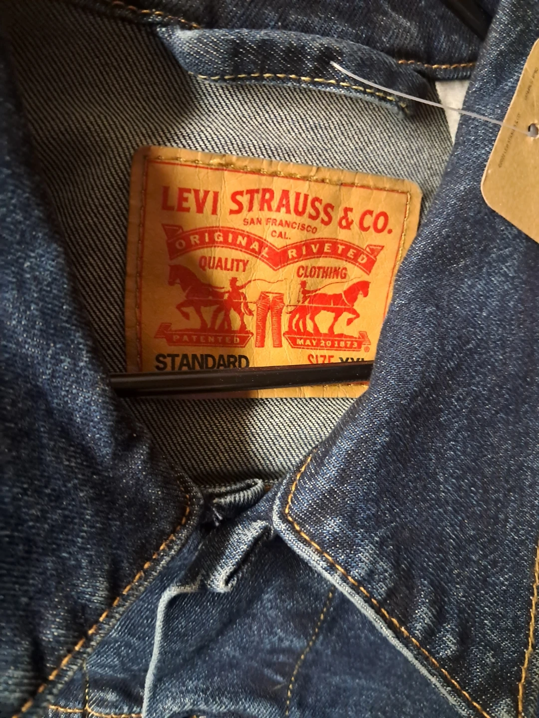 Classic Levi Strauss & Co. denim jacket in a dark wash. It's a size XXL/TIG. Made of durable denim material.