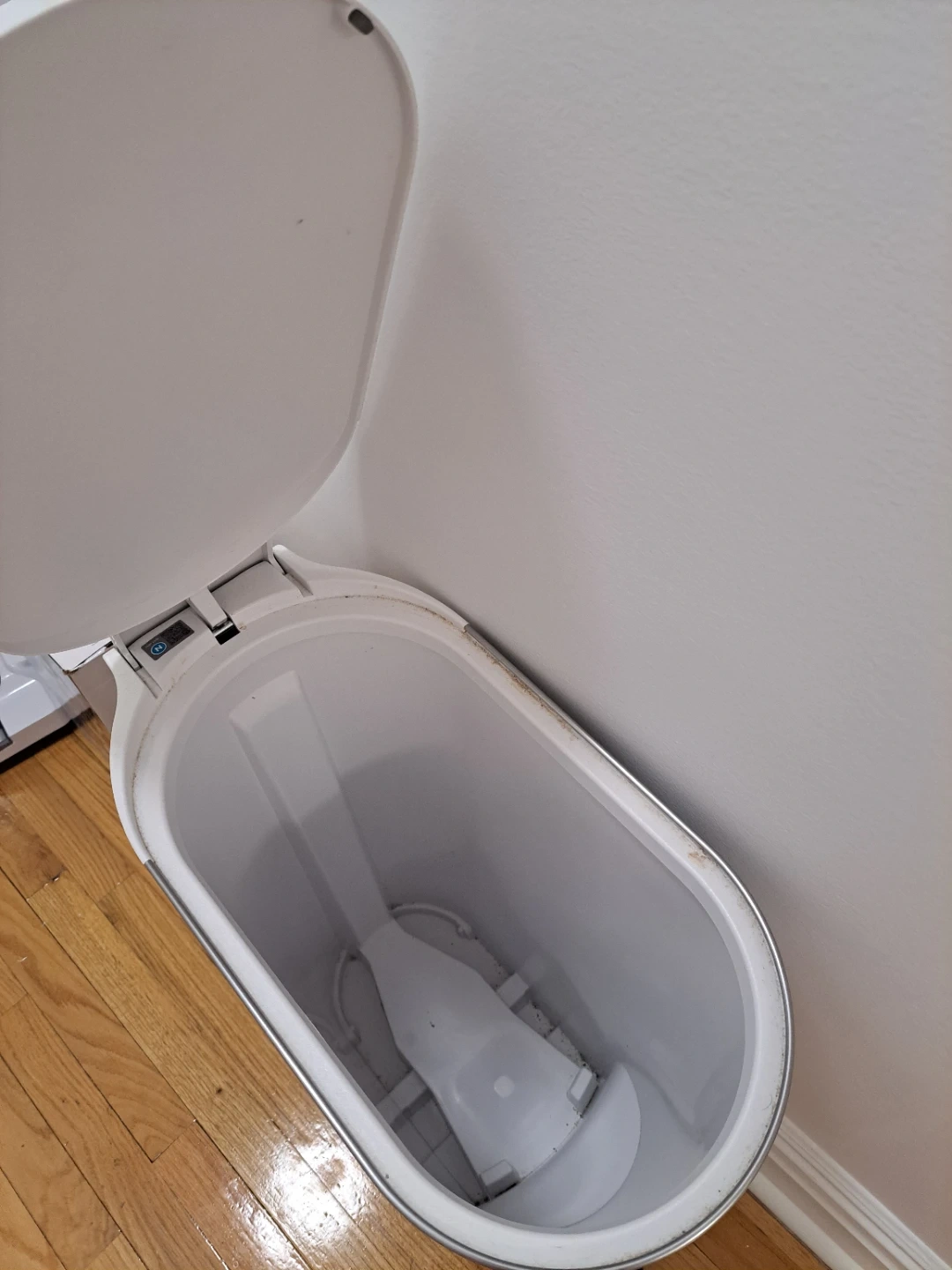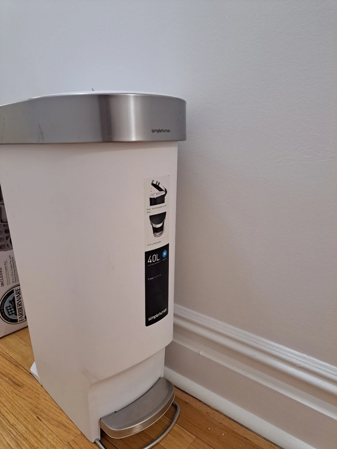 This simplehuman step can is a 40L capacity trash can. It's white with a brushed steel lid and pedal. Perfect for small spaces like bathrooms or offices!