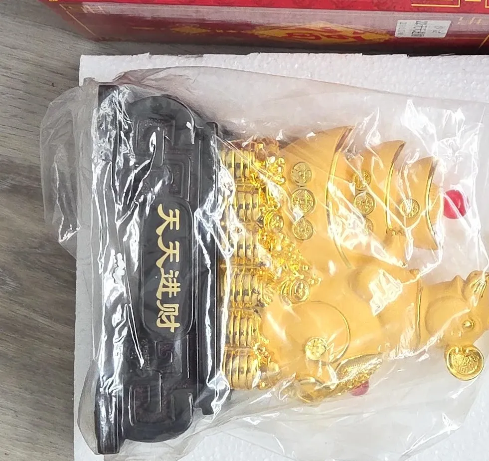 This is a beautiful Feng Shui rat statue, still in its original packaging! It's a lovely golden colour and comes with a black base. Perfect for adding a touch of elegance and good fortune to your home or office