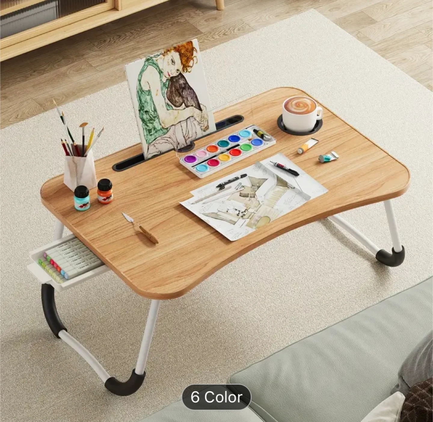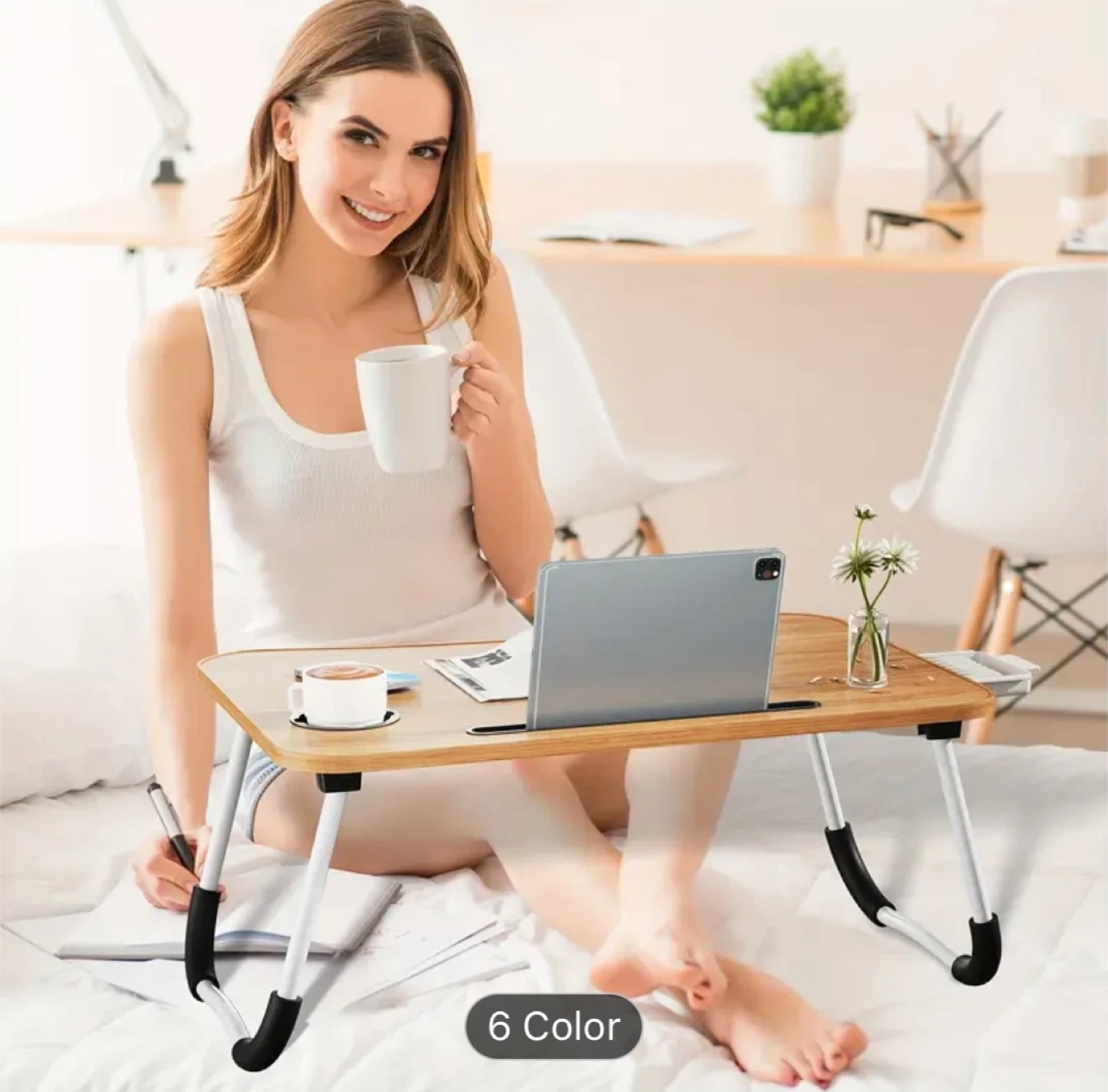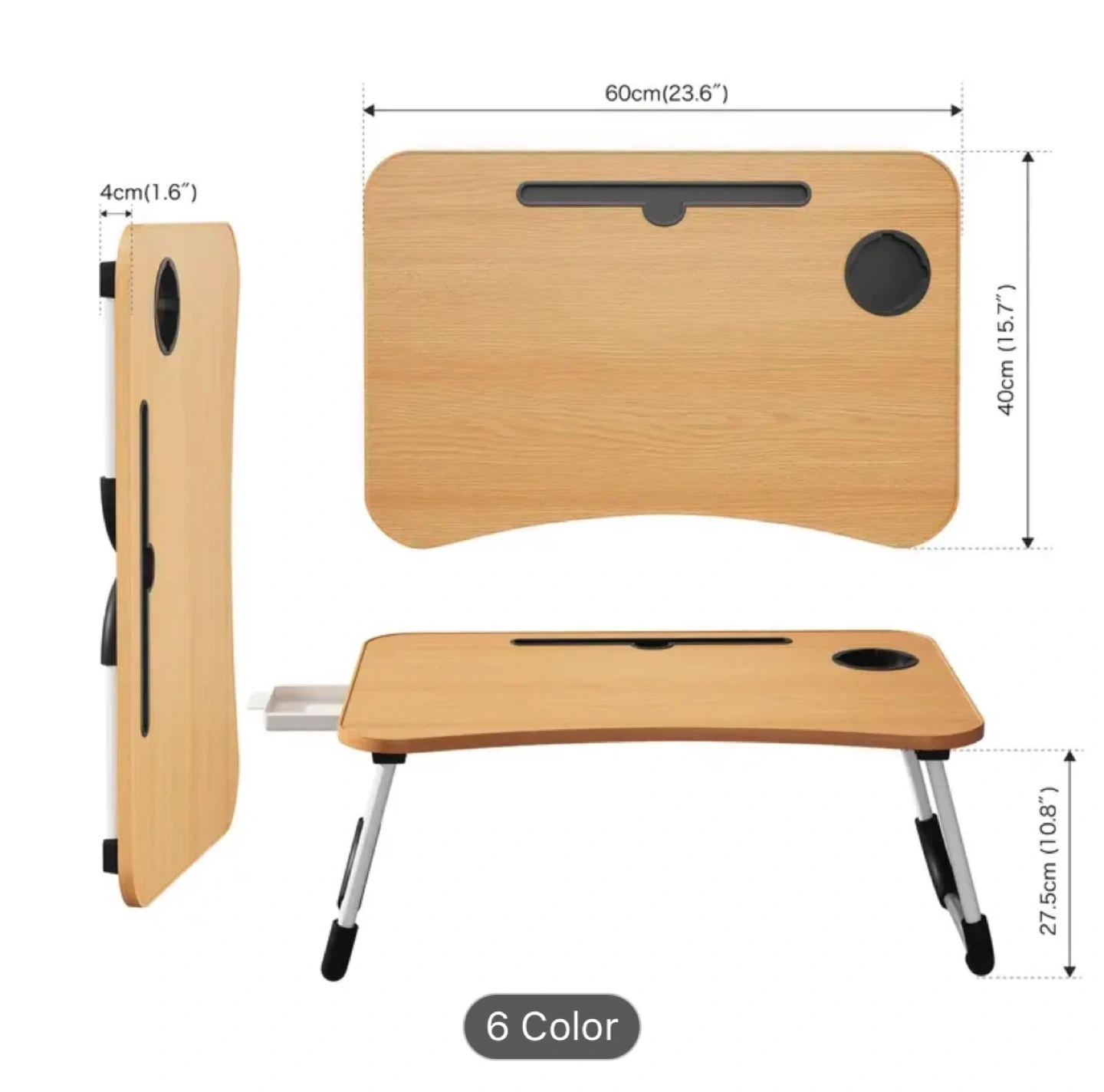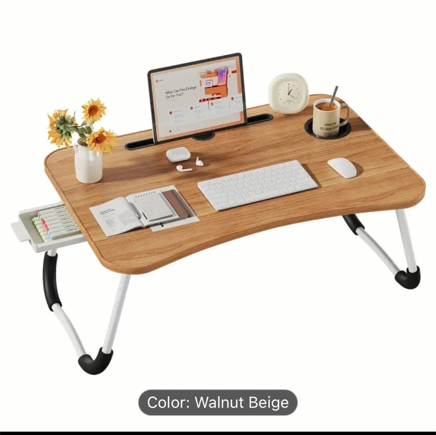 This foldable lap desk is designed for convenience and portability. It features a durable wooden surface in a walnut beige finish and sturdy metal legs that fold flat for easy storage. The desk includes a built-in slot for tablets or books and a cup holder. Its compact size makes it great for working or studying from bed, the couch, or even on the go.