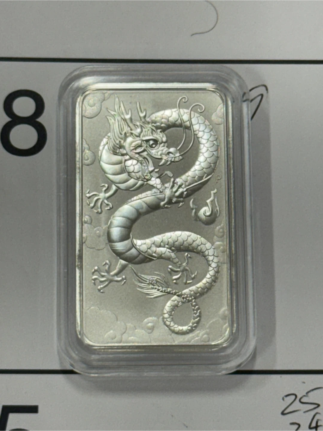 This is a 1 oz .9999 fine silver bullion bar from Australia. It features Queen Elizabeth II on one side and a dragon design on the other. The year is 2019. A great piece for any collector!