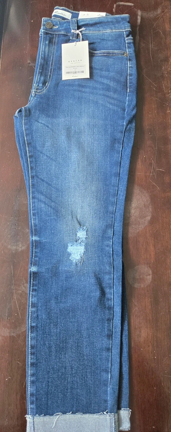 Brand New Never Worn. These Kancan jeans are a mid rise ankle skinny style in a size 9/28. They feature a distressed detail on one leg. Denim is a versatile and reliable fabric.