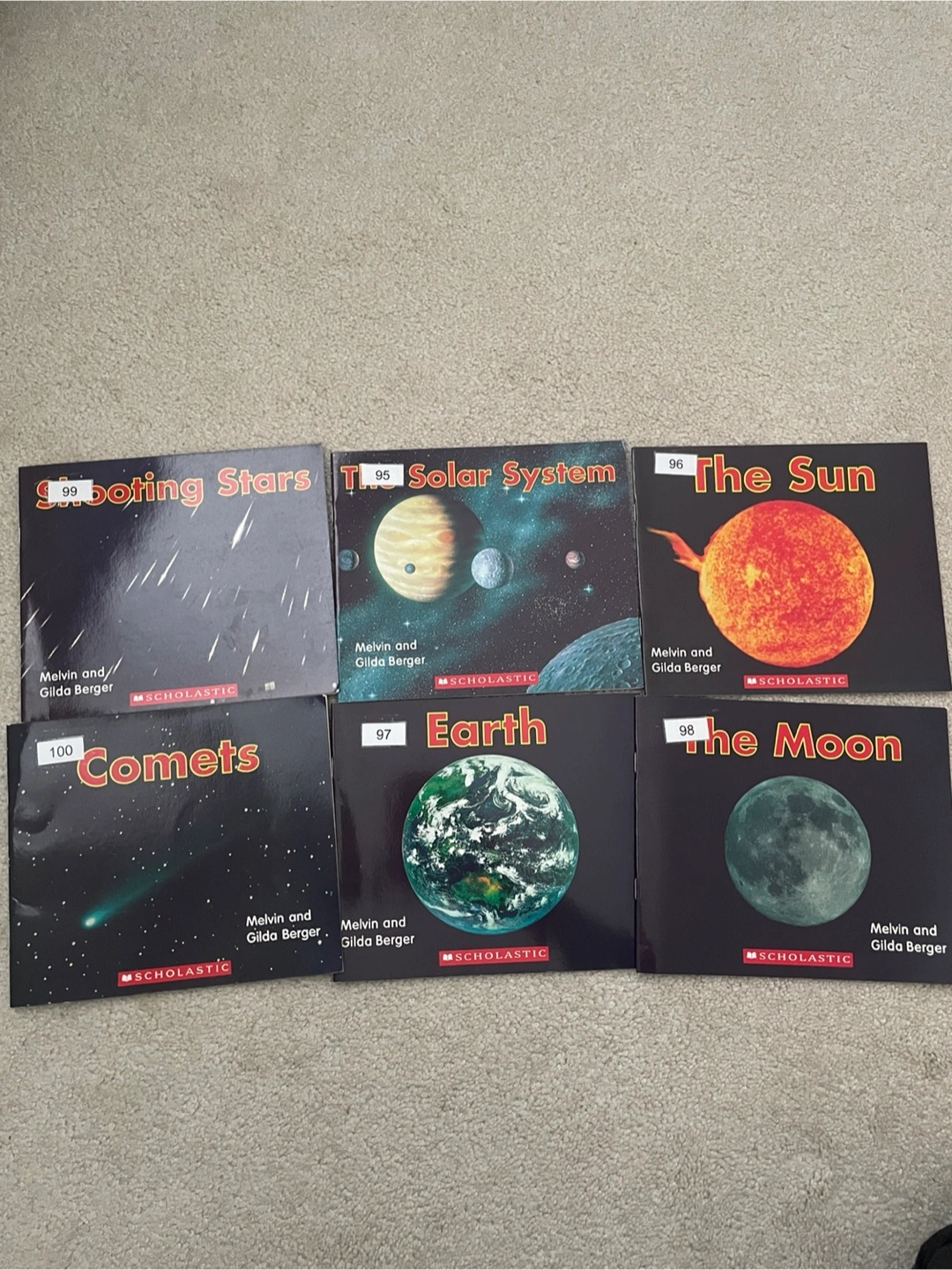 Selling a set of Scholastic books about space, written by Melvin and Gilda Berger! The titles include: