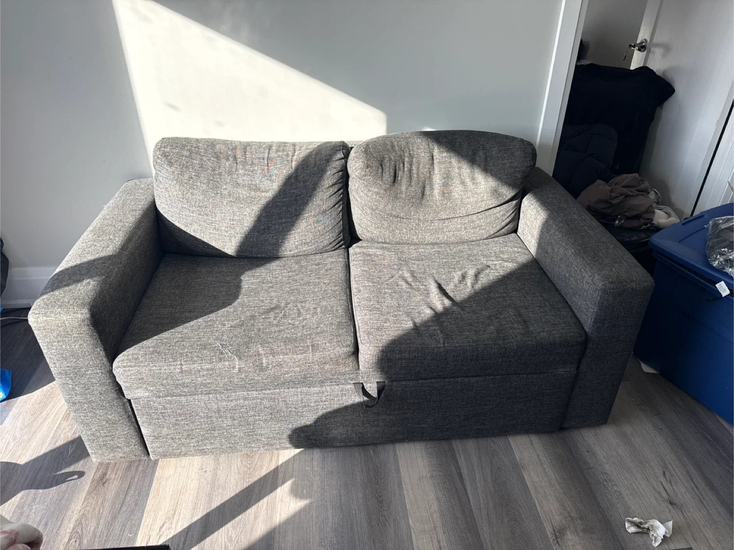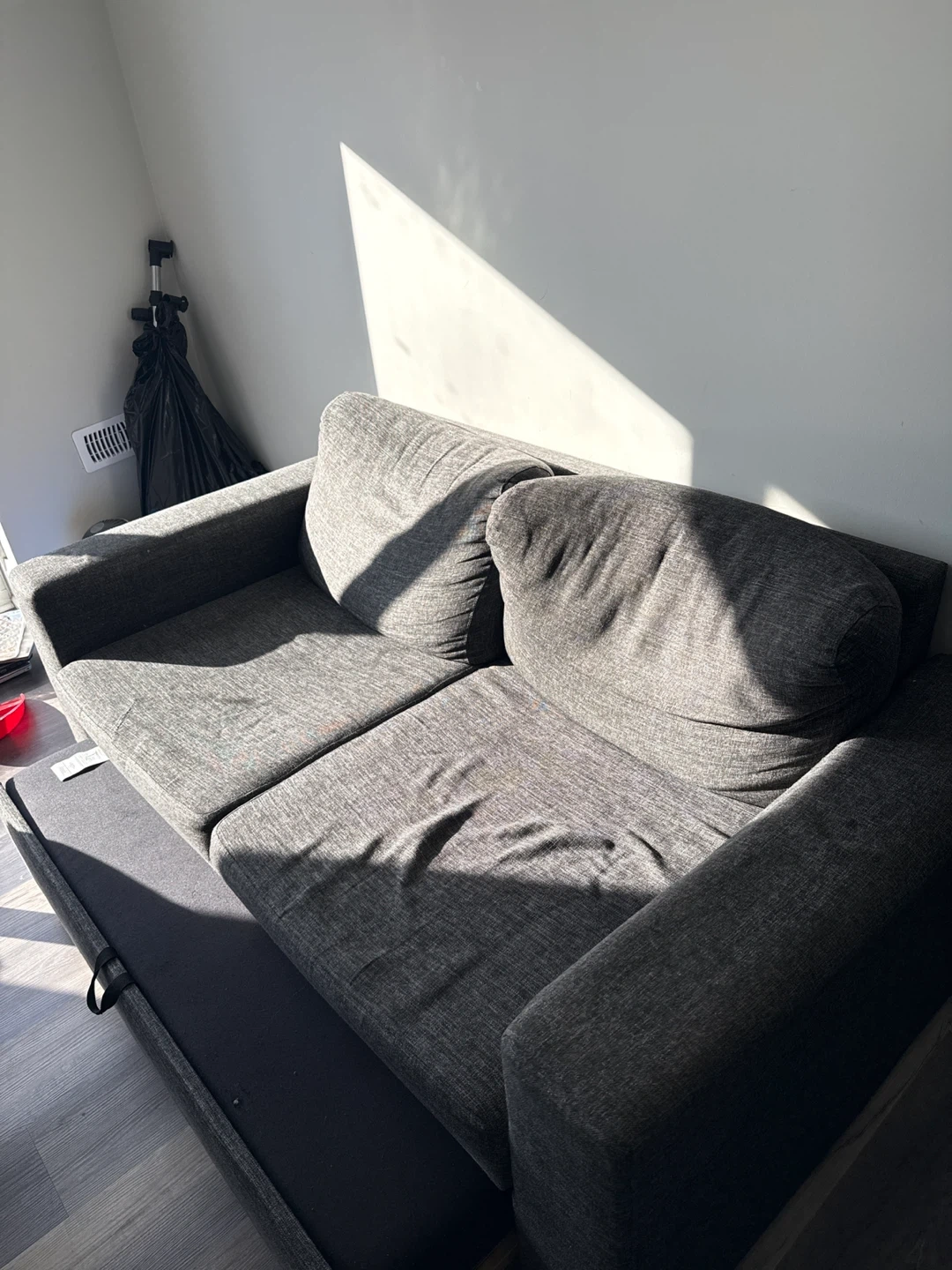 Selling a comfy grey sofa bed! It's in great condition and would be perfect for a living room or spare room. It easily converts into a bed for guests or extra sleeping space. It's a stylish and functional piece of furniture!