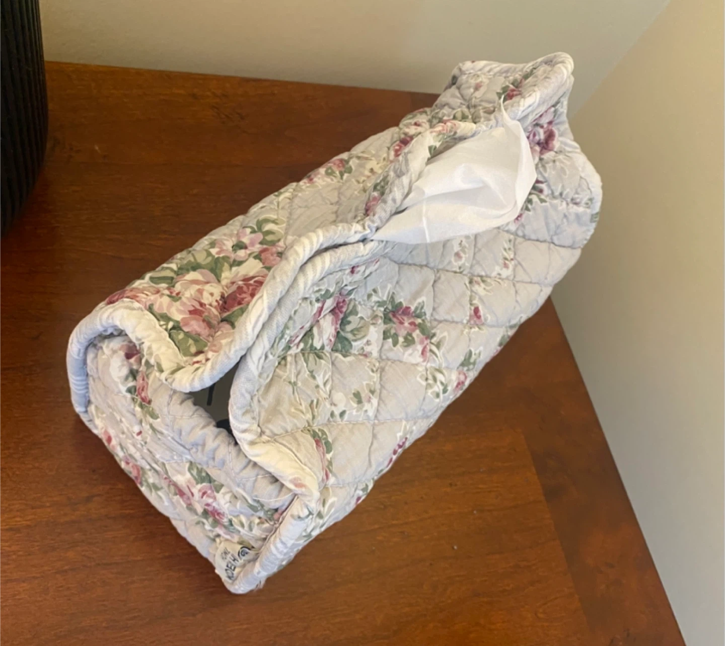 This is a charming floral quilted tissue box cover! It's in great condition and would add a cozy touch to any room. The quilted design features a pretty floral pattern in shades of grey, white, and pink. It's perfect for adding a touch of vintage charm to your home decor