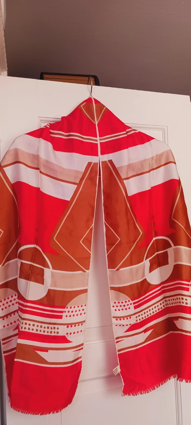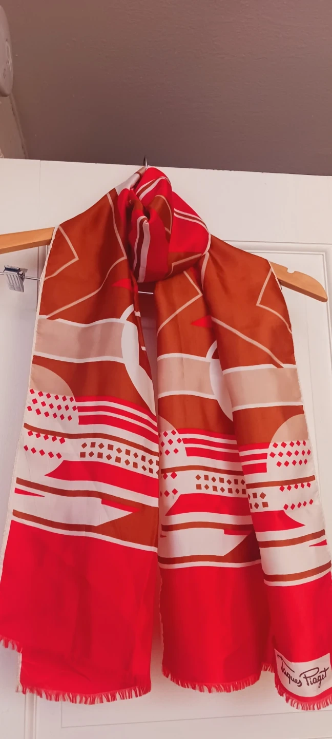 NEW !!Selling a beautiful Jacques Piagett scarf with a unique geometric pattern. The colors are a mix of red, brown, and white. It's a stylish accessory to add a pop of color to any outfit!! 68"×13". ALL MY PRICES ARE NEGOTIABLE !!