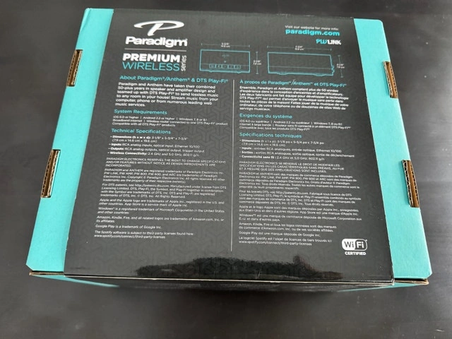 Open box, but in brand new condition. Paradigm PW AMP Premium Wireless Series includes ARC Anthem Room Correction. This is a Class D Amplifier to stream lossless audio wirelessly over standard wireless networks to any pair of non-powered speakers 2x200W Dynamic Peak 2x 100W RMS. This model has been discontinued but was listed by Paradigm for USD 349. In box condition with all components as listed in the user manual, see photos. If the ad is up, it's available. Pick up near Movati in Barrhaven close to Cresthaven and Strandherd.