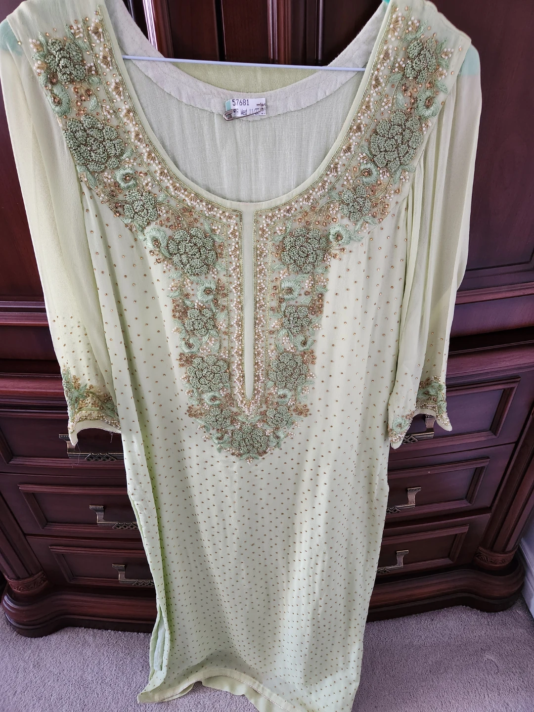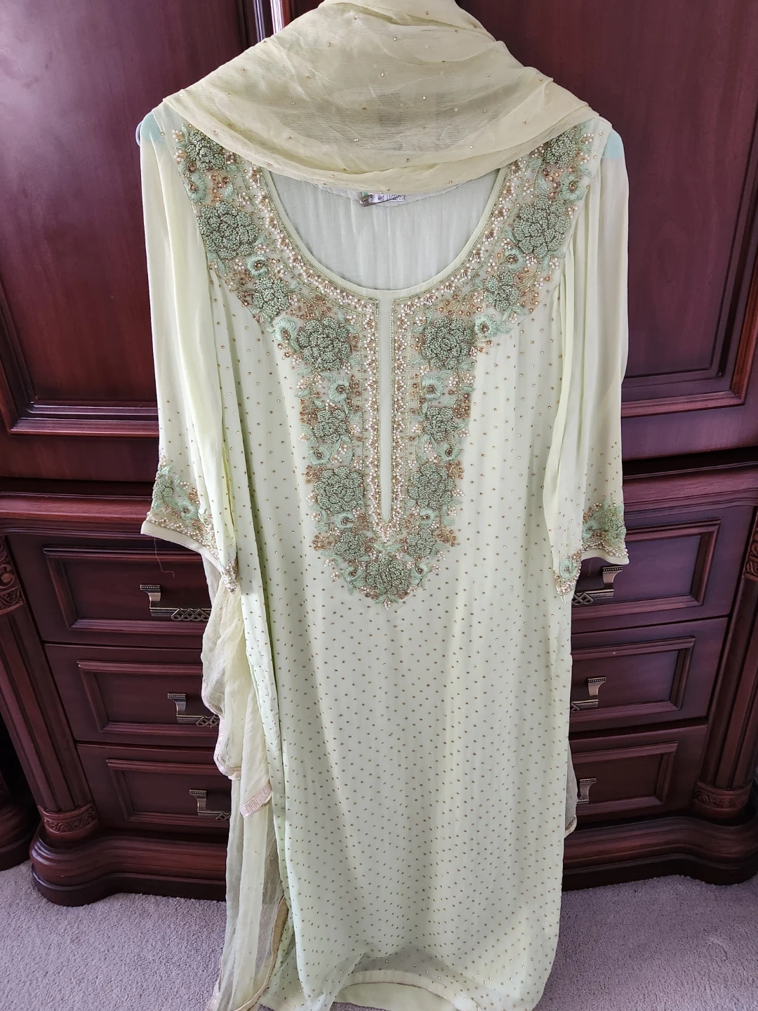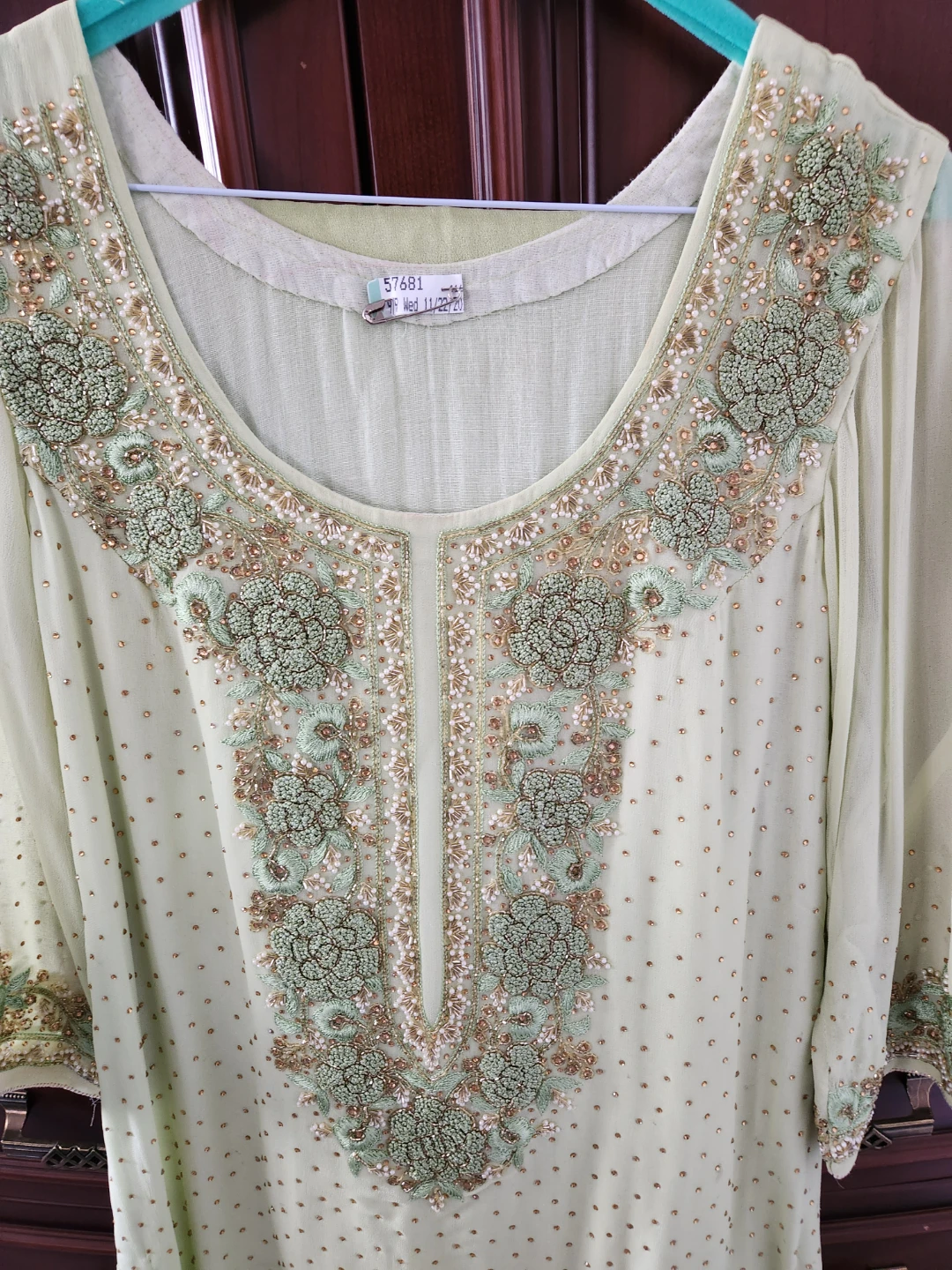 Beautiful light green plazo suit with intricate embroidery. Perfect for special occasions or everyday wear! The material is georgette feels lightweight and comfortable. Trousers are plazo style with light chiffon Mukesh Dupatta. Available for pickup