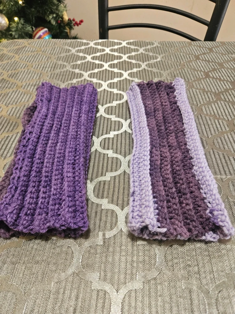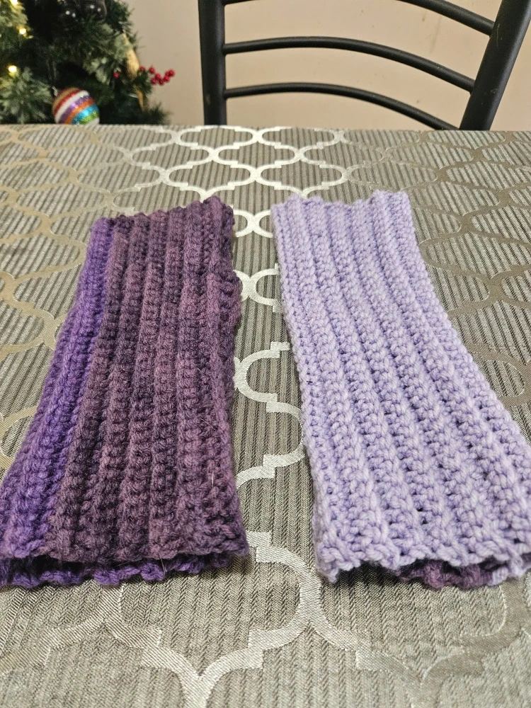 Selling a pair of handmade crochet fingerless gloves! One is a lovely shade of purple, and the other is a lighter lavender colour. Perfect for keeping your hands warm while leaving your fingers free.
