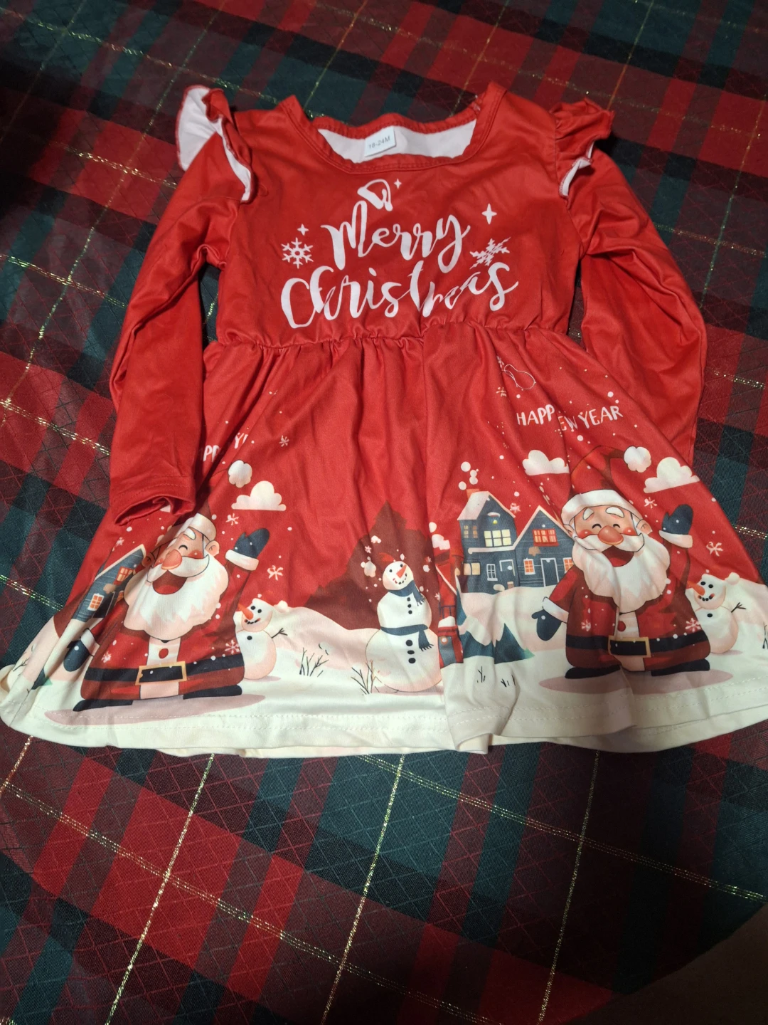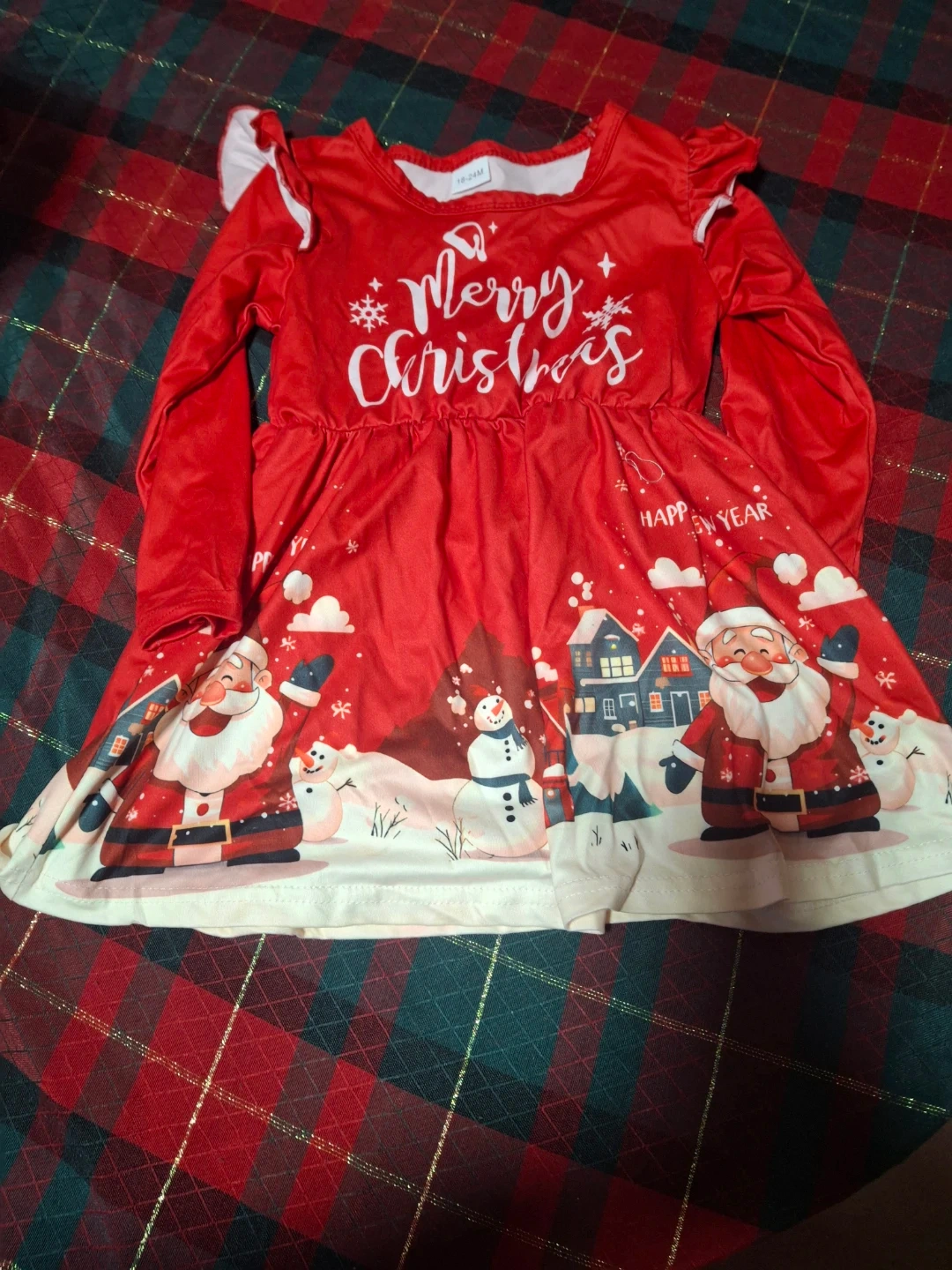 A cute Christmas dress featuring Santa Claus and snowman designs! It's red with long sleeves and perfect for the holidays. The size is 18-24M.