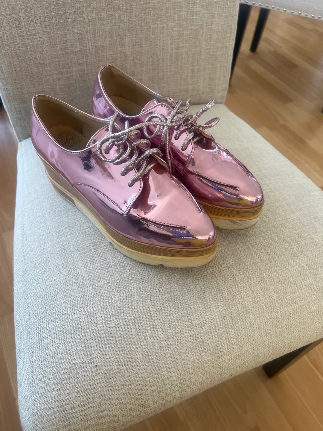 Cute pink platform shoes! They have a shiny, patent leather-like finish and a unique, eye-catching design. Perfect for adding a bit of fun to your outfit!