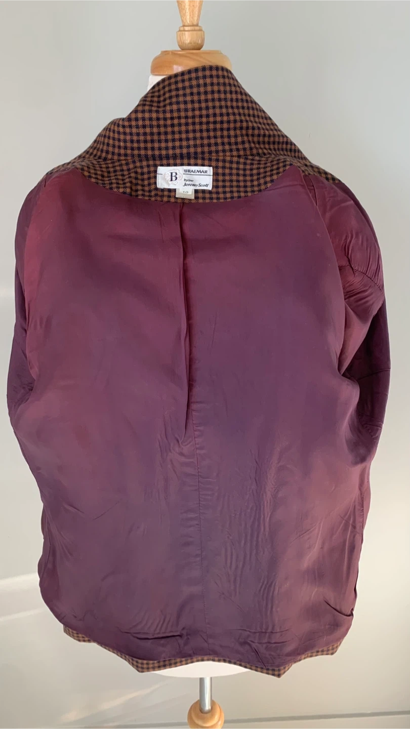 Absolutely stunning vintage Jeremy Scott wool blazer. Made in Canada this gem is crafted from 100% virgin wool. It is fully lined with a rich plum colored fabric. There are two pockets on the front and has gold double breasted buttons. Excellent condition, size 10.