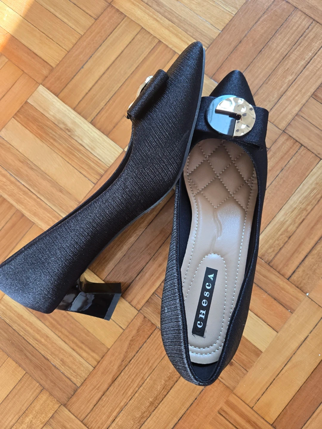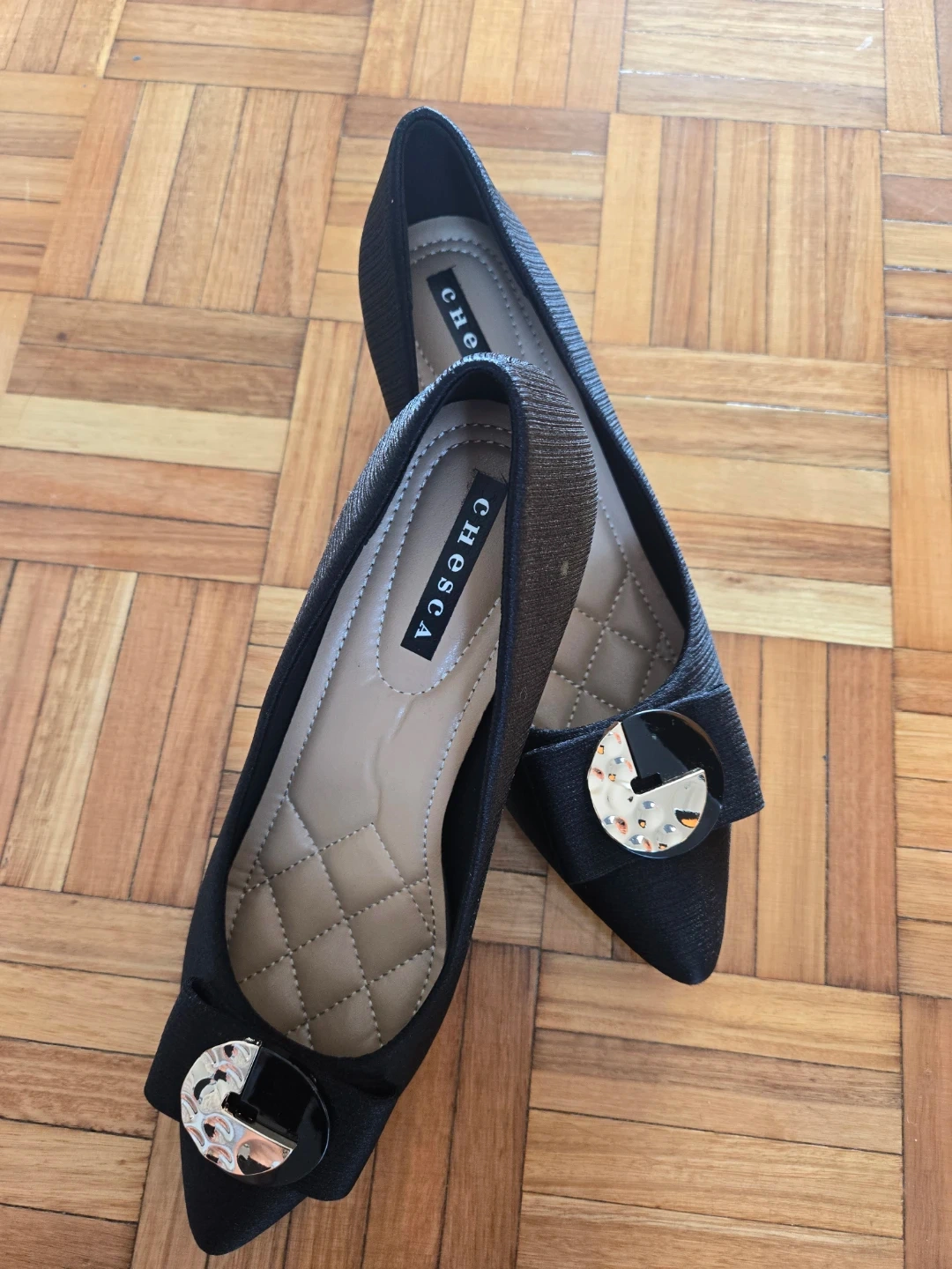Selling a pair of stylish black flats from Chesca! They feature a unique buckle detail and a comfortable quilted insole. These flats are perfect for adding a touch of elegance to any outfit (Used once)