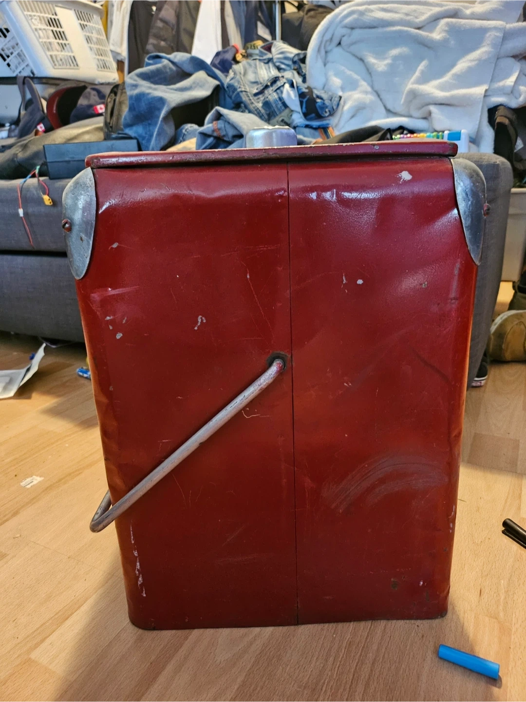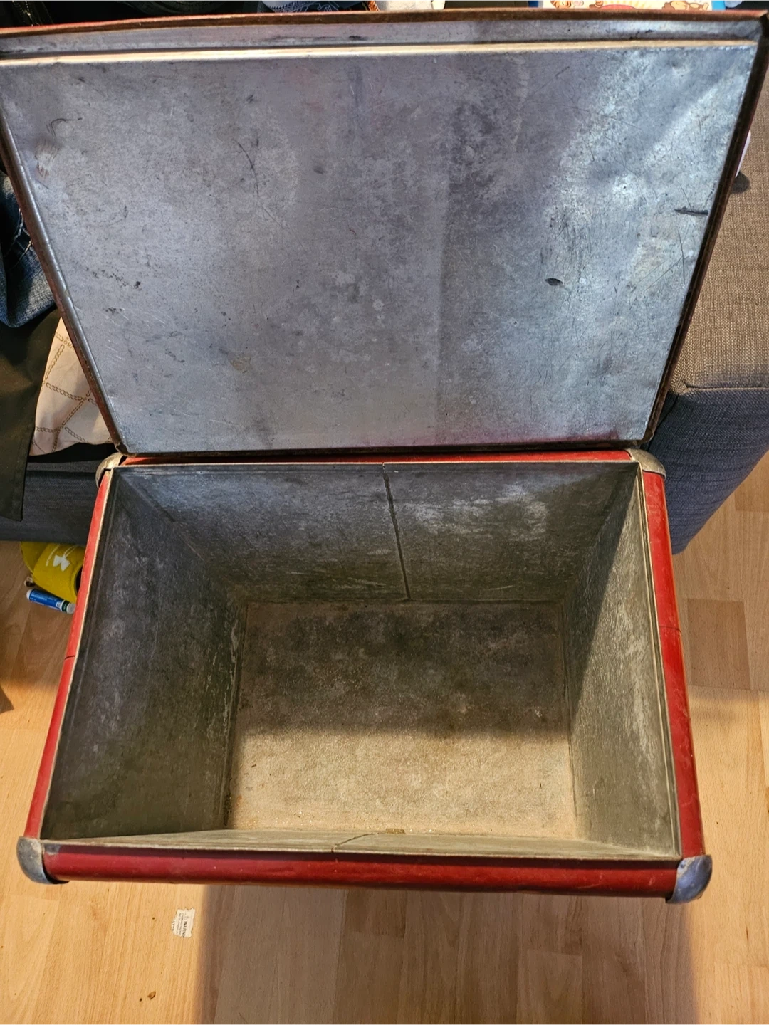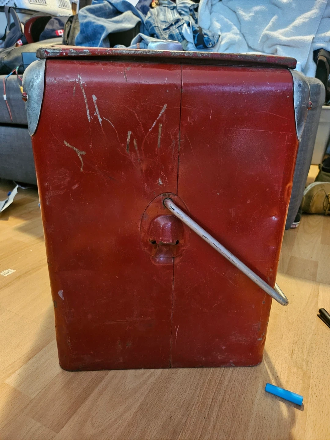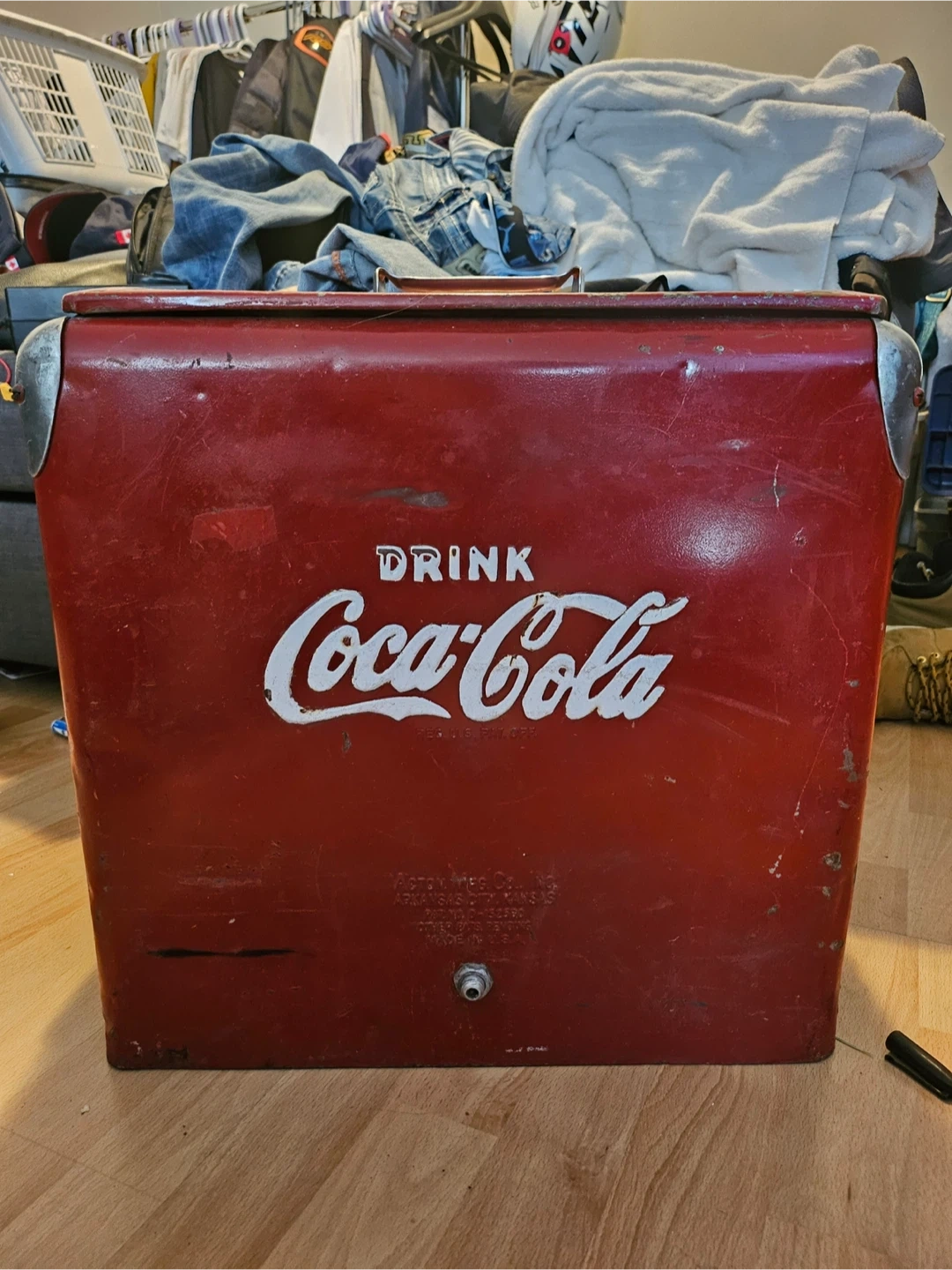 Selling a vintage Coca-Cola cooler! It's red with the classic Coca-Cola logo on the front. It shows some signs of wear, which adds to its vintage charm. Perfect for collectors or anyone who loves retro items!